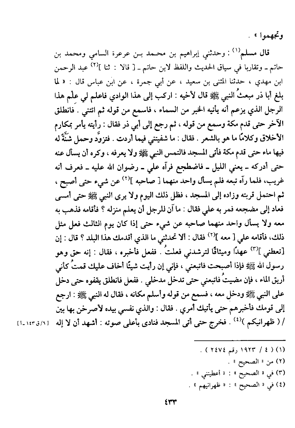 قَالَ مُسلم: وحَدثني إِبْرَاهِيم بن مُحَمَّد بن عرْعرة السَّامِي وَمُحَمّد بن حَاتِم - وتقاربا فِي سِيَاق الحَدِيث وَاللَّفْظ لِابْنِ حَاتِم -[قَالَا: ثَنَا] عبد الرَّحْمَن ابْن مهْدي، حَدثنَا الْمثنى بن سعيد، عَن أبي جَمْرَة، عَن ابْن عَبَّاس قَالَ: " لما بلغ أَبَا ذَر مبعث النَّبِي - صَلَّى اللَّهُ عَلَيْهِ وَسَلَّم َ - قَالَ لِأَخِيهِ: اركب إِلَى هَذَا الْوَادي فَاعْلَم لي علم هَذَا الرجل الَّذِي يزْعم أَنه يَأْتِيهِ الْخَبَر من السَّمَاء، فاسمع من قَوْله ثمَّ ائْتِنِي. فَانْطَلق الآخر حَتَّى قدم مَكَّة وَسمع من قَوْله، ثمَّ رَجَعَ إِلَى أبي ذَر فَقَالَ: رَأَيْته يَأْمر بمكارم الْأَخْلَاق وكلاما مَا هُوَ بالشعر. فَقَالَ: مَا شفيتني فِيمَا أردْت. فتزود وَحمل شنة لَهُ فِيهَا مَاء حَتَّى قدم مَكَّة فَأتى الْمَسْجِد فالتمس النَّبِي - صَلَّى اللَّهُ عَلَيْهِ وَسَلَّم َ - وَلَا يعرفهُ، وَكره أَن يسْأَل عَنهُ حَتَّى أدْركهُ - يَعْنِي اللَّيْل - فاضطجع فَرَآهُ عَليّ - رضوَان الله عَلَيْهِ - فَعرف أَنه غَرِيب، فَلَمَّا رَآهُ تبعه فَلم يسْأَل وَاحِد مِنْهُمَا [صَاحبه] عَن شَيْء حَتَّى أصبح، ثمَّ احْتمل قربته وزاده إِلَى الْمَسْجِد، فظل ذَلِك الْيَوْم وَلَا يرى النَّبِي - صَلَّى اللَّهُ عَلَيْهِ وَسَلَّم َ - حَتَّى أَمْسَى فَعَاد إِلَى مضجعه فَمر بِهِ عَليّ فَقَالَ: مَا آن للرجل أَن يعلم منزله؟ فأقامه فَذهب بِهِ مَعَه وَلَا يسْأَل وَاحِد مِنْهُمَا صَاحبه عَن شَيْء حَتَّى إِذا كَانَ يَوْم الثَّالِث فعل مثل ذَلِك، فأقامه عَليّ [مَعَه] فَقَالَ: أَلا تُحَدِّثنِي مَا الَّذِي أقدمك هَذَا الْبَلَد؟ قَالَ: إِن [تعطني] عهدا وميثاقا لترشدني فعلت. فَفعل فَأخْبرهُ، فَقَالَ: إِنَّه حق وَهُوَ رَسُول الله - صَلَّى اللَّهُ عَلَيْهِ وَسَلَّم َ - فَإِذا أَصبَحت فاتبعني، فَإِنِّي إِن رَأَيْت شَيْئا أَخَاف عَلَيْك قُمْت كَأَنِّي أريق المَاء، فَإِن مضيت فاتبعني حَتَّى تدخل مدخلي. فَفعل فَانْطَلق يقفوه حَتَّى دخل على النَّبِي - صَلَّى اللَّهُ عَلَيْهِ وَسَلَّم َ - وَدخل مَعَه، فَسمع من قَوْله وَأسلم مَكَانَهُ، فَقَالَ لَهُ النَّبِي - صَلَّى اللَّهُ عَلَيْهِ وَسَلَّم َ -: ارْجع إِلَى قَوْمك فَأخْبرهُم حَتَّى يَأْتِيك أَمْرِي، فَقَالَ: وَالَّذِي نَفسِي بِيَدِهِ لأصرخن بهَا بَين / (ظهرانيكم) . فَخرج حَتَّى أَتَى الْمَسْجِد فَنَادَى بِأَعْلَى صَوته: أشهد أَن لَا إِلَه
