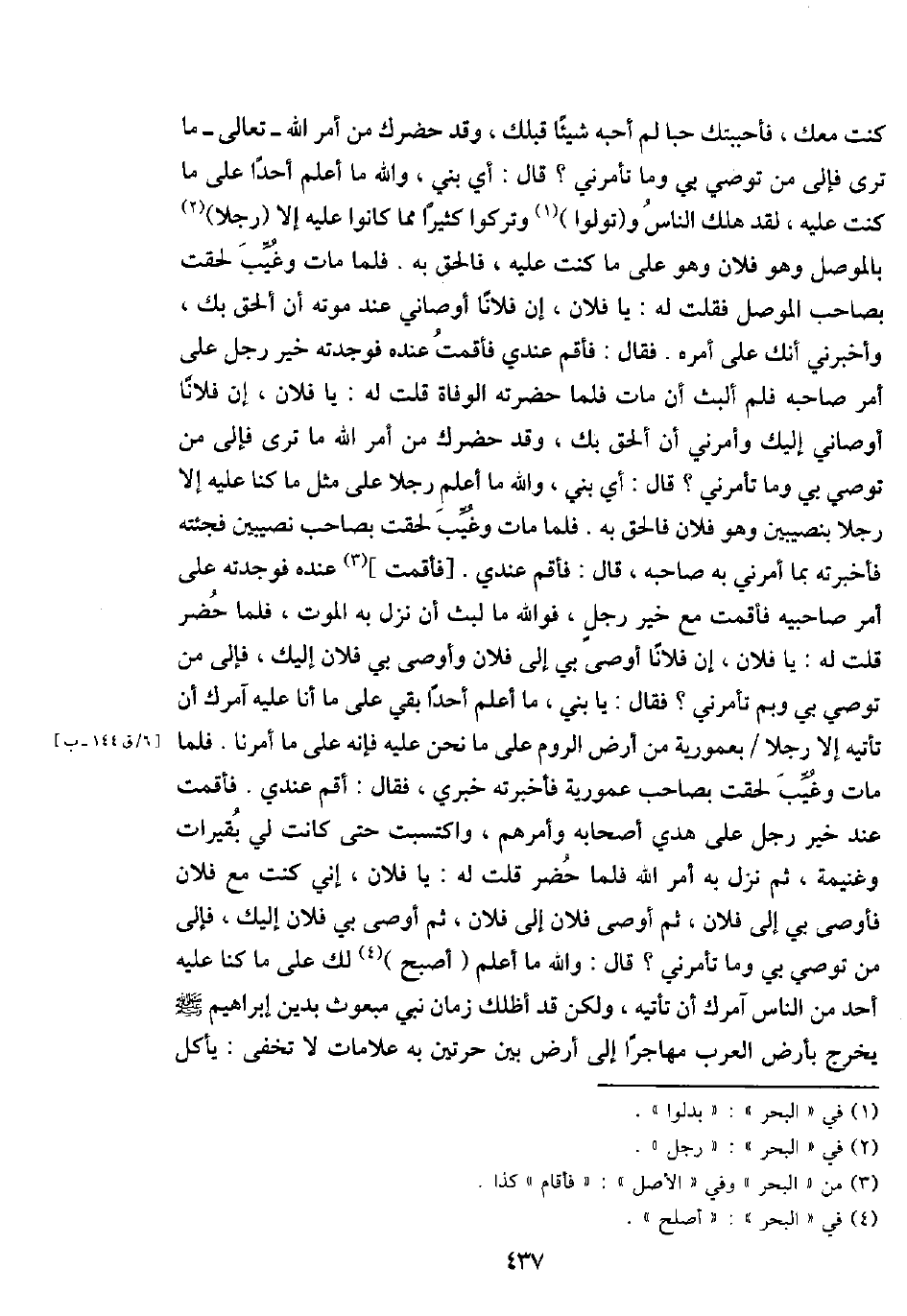 كنت مَعَك، فأحببتك حبا لم أحبه شَيْئا قبلك، وَقد حضرك من أَمر الله - تَعَالَى - مَا ترى فَإلَى من توصي بِي وَمَا تَأْمُرنِي؟ قَالَ: أَي بني، وَالله مَا أعلم أحدا على مَا كنت عَلَيْهِ، لقد هلك النَّاس و (توَلّوا) وَتركُوا كثيرا مِمَّا كَانُوا عَلَيْهِ إِلَّا (رجلا) بالموصل وَهُوَ فلَان وَهُوَ على مَا كنت عَلَيْهِ، فَالْحق بِهِ. فَلَمَّا مَاتَ وغيب لحقت بِصَاحِب الْموصل فَقلت لَهُ: يَا فلَان، إِن فلَانا أَوْصَانِي عِنْد مَوته أَن ألحق بك، وَأَخْبرنِي أَنَّك على أمره. فَقَالَ: فأقم عِنْدِي فأقمت عِنْده فَوَجَدته خير رجل على أَمر صَاحبه فَلم ألبث أَن مَاتَ فَلَمَّا حَضرته الْوَفَاة قلت لَهُ: يَا فلَان، إِن فلَانا أَوْصَانِي إِلَيْك وَأَمرَنِي أَن ألحق بك، وَقد حضرك من أَمر الله مَا ترى فَإلَى من توصي بِي وَمَا تَأْمُرنِي؟ قَالَ: أَي بني، وَالله مَا أعلم رجلا على مثل مَا كُنَّا عَلَيْهِ إِلَّا رجلا بنصيبين وَهُوَ فلَان فَالْحق بِهِ. فَلَمَّا مَاتَ وغيب لحقت بِصَاحِب نَصِيبين فَجِئْته فَأَخْبَرته بِمَا أَمرنِي بِهِ صَاحبه، قَالَ: فأقم عِنْدِي. [فأقمت] عِنْده فَوَجَدته على أَمر صَاحِبيهِ فأقمت مَعَ خير رجل، فوَاللَّه مَا لبث أَن نزل بِهِ الْمَوْت، فَلَمَّا حضر قلت لَهُ: يَا فلَان، إِن فلَانا أوصى بِي إِلَى فلَان وَأوصى بِي فلَان إِلَيْك، فَإلَى من توصي بِي وَبِمَ تَأْمُرنِي؟ فَقَالَ: يَا بني، مَا أعلم أحدا بَقِي على مَا أَنا عَلَيْهِ آمُرك أَن تَأتيه إِلَّا رجلا / بعمورية من أَرض الرّوم على مَا نَحن عَلَيْهِ فَإِنَّهُ على مَا أمرنَا. فَلَمَّا مَاتَ وغيب لحقت بِصَاحِب عمورية فَأَخْبَرته خبري، فَقَالَ: أقِم عِنْدِي. فأقمت عِنْد خير رجل على هدي أَصْحَابه وَأمرهمْ، واكتسبت حَتَّى كَانَت لي بقيرات وغنيمة، ثمَّ نزل بِهِ أَمر الله فَلَمَّا حضر قلت لَهُ: يَا فلَان، إِنِّي كنت مَعَ فلَان فأوصى بِي إِلَّا فلَان، ثمَّ أوصى بِي إِلَى فلَان، ثمَّ أوصى بِي فلَان إِلَيْك، فَإلَى من توصي بِي وَمَا تَأْمُرنِي؟ قَالَ: وَالله مَا أعلم (أصبح) لَك على مَا كُنَّا عَلَيْهِ أحد من النَّاس آمُرك أَن تَأتيه، وَلَكِن قد أظلك زمَان نَبِي مَبْعُوث بدين إِبْرَاهِيم - صَلَّى اللَّهُ عَلَيْهِ وَسَلَّم َ - يخرج بِأَرْض الْعَرَب مُهَاجرا إِلَى أَرض بَين حرتين بِهِ عَلَامَات لَا تخفى: يَأْكُل