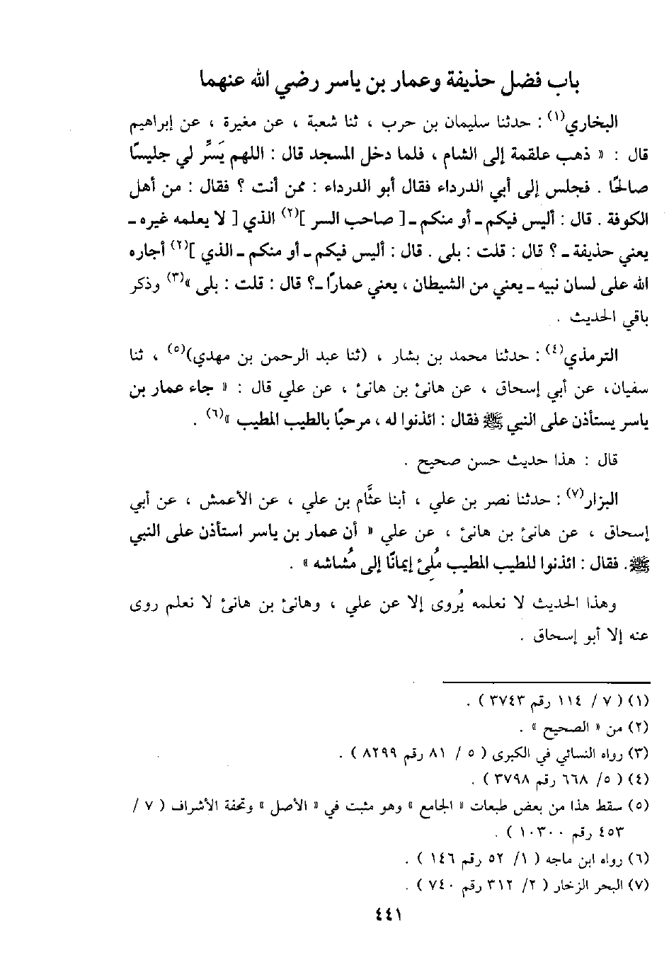 التِّرْمِذِيّ: حَدثنَا مُحَمَّد بن بشار، (ثَنَا عبد الرَّحْمَن بن مهْدي) ، ثَنَا سُفْيَان، عَن أبي إِسْحَاق، عَن هَانِئ بن هَانِئ، عَن عَليّ قَالَ: " جَاءَ عمار بن يَاسر يسْتَأْذن على النَّبِي - صَلَّى اللَّهُ عَلَيْهِ وَسَلَّم َ - فَقَالَ: ائذنوا لَهُ، مرْحَبًا بالطيب المطيب ".