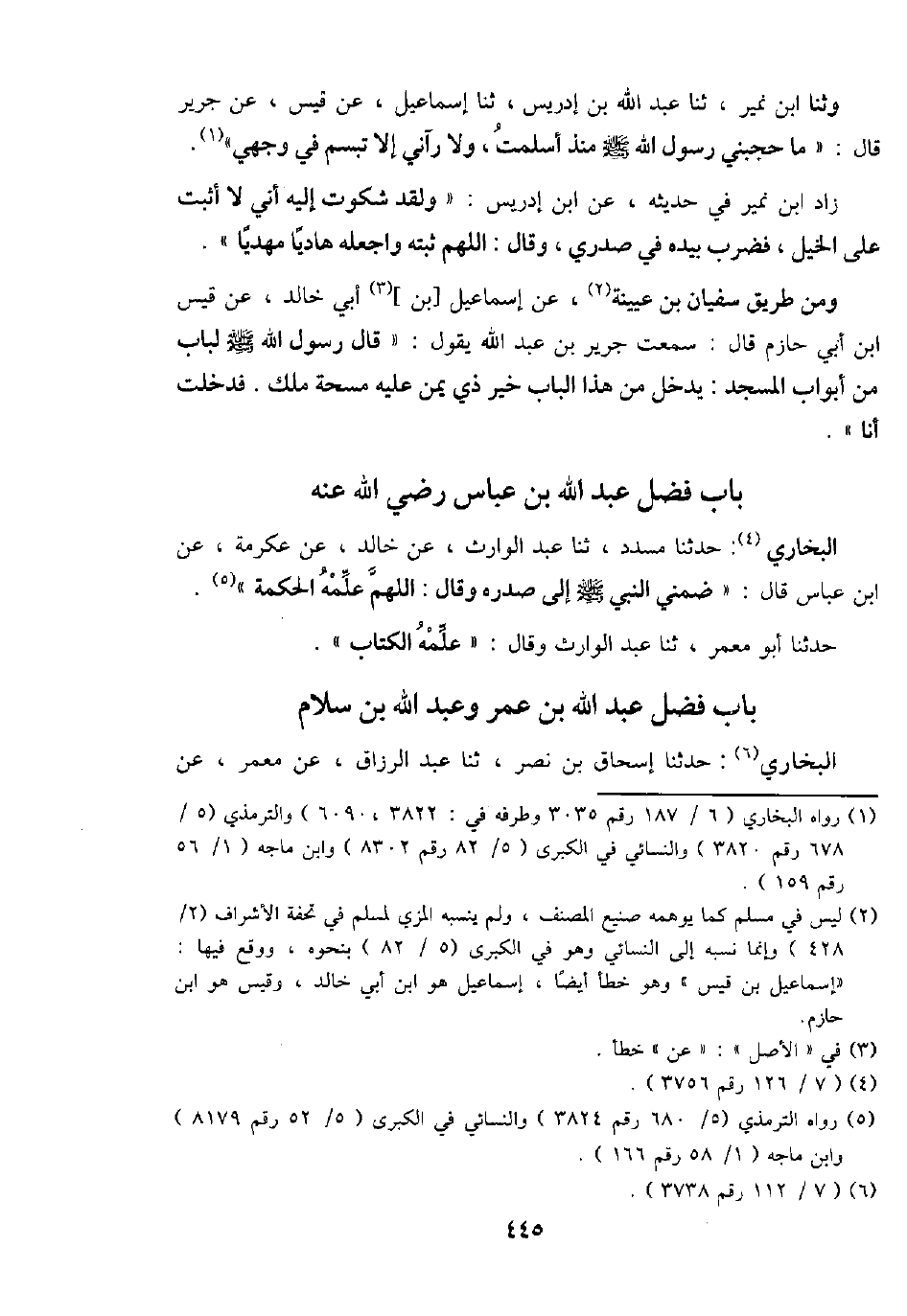وثنا ابْن نمير، ثَنَا عبد الله بن إِدْرِيس، ثَنَا إِسْمَاعِيل، عَن قيس، عَن جرير قَالَ: " مَا حجبني رَسُول الله - صَلَّى اللَّهُ عَلَيْهِ وَسَلَّم َ - مُنْذُ أسلمت، وَلَا آراني إِلَّا تَبَسم فِي وَجْهي ".