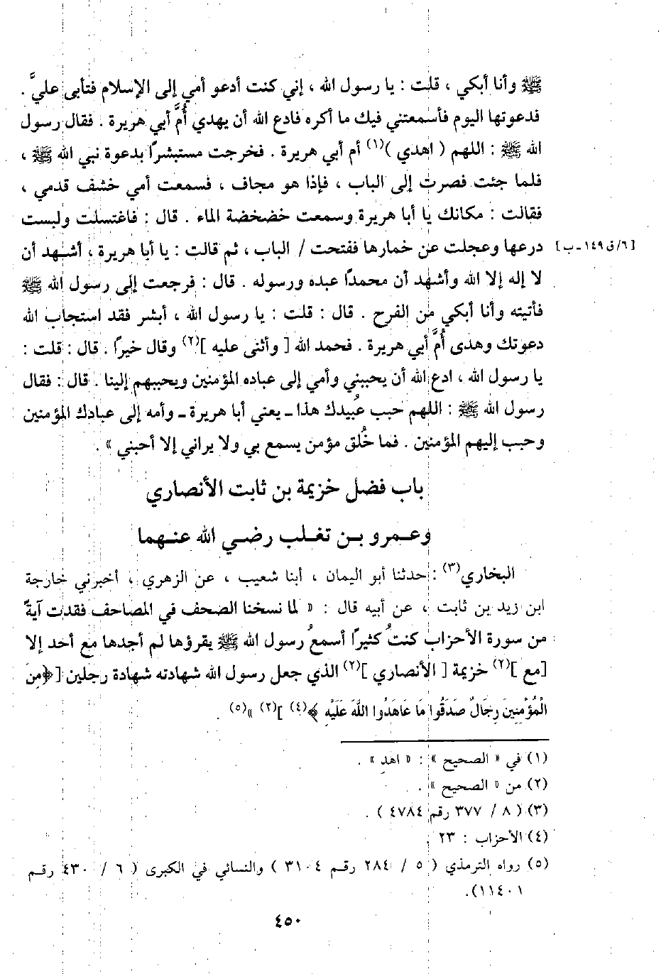 البُخَارِيّ: حَدثنَا أَبُو الْيَمَان، أبنا شُعَيْب، عَن الزُّهْرِيّ، أَخْبرنِي خَارِجَة ابْن زيد بن ثَابت، عَن أَبِيه قَالَ: " لما نسخنا الصُّحُف فِي الْمَصَاحِف فقدت آيَة من سُورَة الْأَحْزَاب كنت كثيرا أسمع رَسُول الله - صَلَّى اللَّهُ عَلَيْهِ وَسَلَّم َ - يقْرؤهَا لم أَجدهَا مَعَ أحد إِلَّا [مَعَ] خُزَيْمَة [الْأنْصَارِيّ] الَّذِي جعل الله شَهَادَته شَهَادَة رجلَيْنِ [ {من الْمُؤمنِينَ رجال صدقُوا مَا عَاهَدُوا الله عَلَيْهِ} ] ".