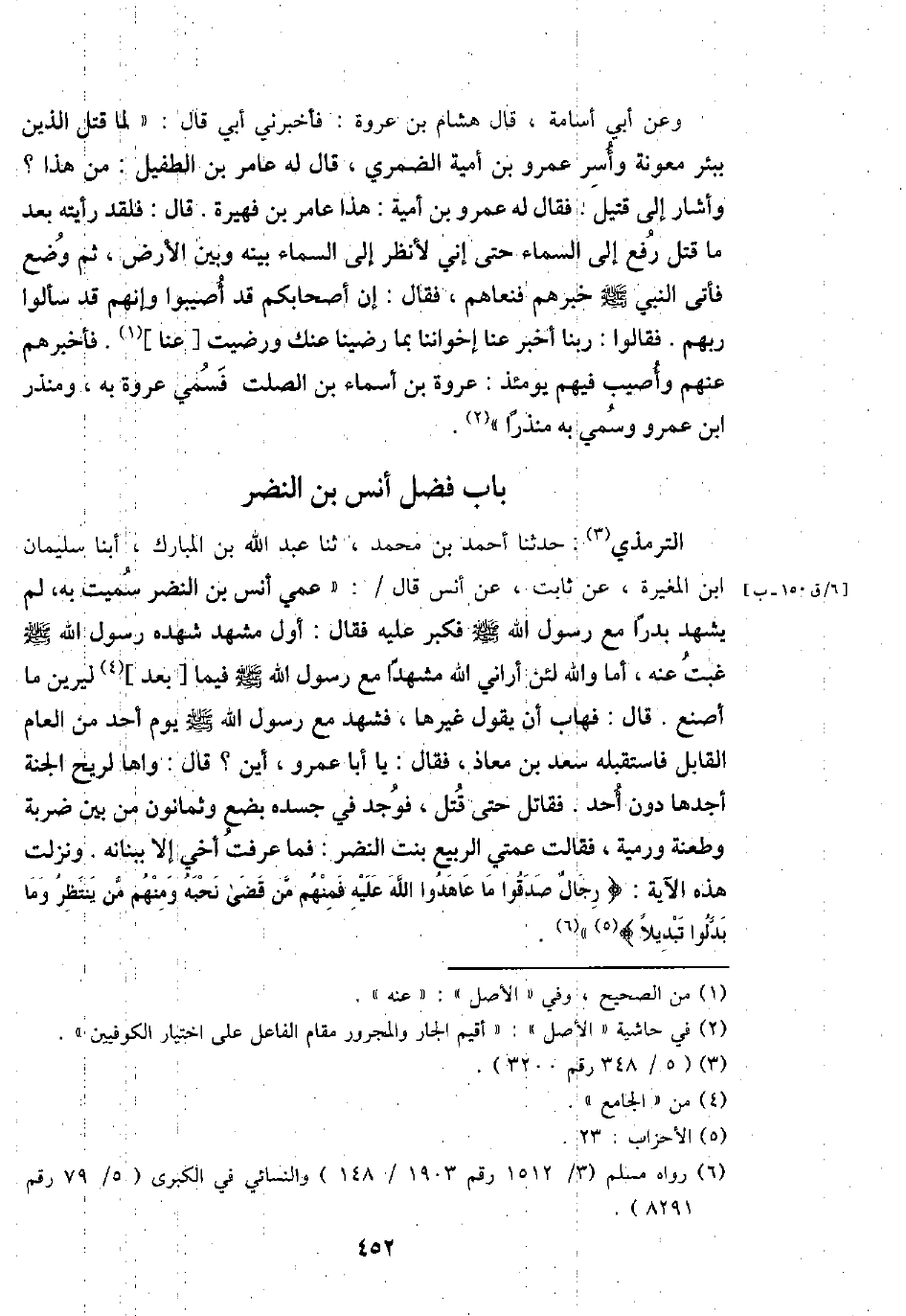 التِّرْمِذِيّ: حَدثنَا أَحْمد بن مُحَمَّد، ثَنَا عبد الْملك بن الْمُبَارك، أبنا سُلَيْمَان ابْن الْمُغيرَة، عَن ثَابت، عَن أنس قَالَ /: " عمي أنس بن النَّضر سميت بِهِ، لم يشْهد بَدْرًا مَعَ رَسُول الله - صَلَّى اللَّهُ عَلَيْهِ وَسَلَّم َ - فَكبر عَلَيْهِ فَقَالَ: أول مشْهد شهده رَسُول الله - صَلَّى اللَّهُ عَلَيْهِ وَسَلَّم َ - غبت عَنهُ، أما وَالله لَئِن أَرَانِي الله مشهدا مَعَ رَسُول الله - صَلَّى اللَّهُ عَلَيْهِ وَسَلَّم َ - فِيمَا [بعد] ليرين مَا أصنع. قَالَ: فهاب أَن يَقُول غَيرهَا، فَشهد مَعَ رَسُول الله - صَلَّى اللَّهُ عَلَيْهِ وَسَلَّم َ - يَوْم أحد من الْعَام الْقَابِل فَاسْتَقْبلهُ سعد بن معَاذ، فَقَالَ: يَا أَبَا عَمْرو، أَيْن؟ قَالَ: واها لريح الْجنَّة أَجدهَا دون أحد. فقاتل حَتَّى قتل، فَوجدَ فِي جسده بضع وَثَمَانُونَ من بَين ضَرْبَة وطعنة ورمية، فَقَالَت عَمَّتي الرّبيع بنت النَّضر: فَمَا عرفت أخي إِلَّا ببنانه. وَنزلت هَذِه الْآيَة: {رجال صدقُوا مَا عَاهَدُوا الله عَلَيْهِ فَمنهمْ من قضى نحبه وَمِنْهُم من ينظر وَمَا بدلُوا تبديلا} ".