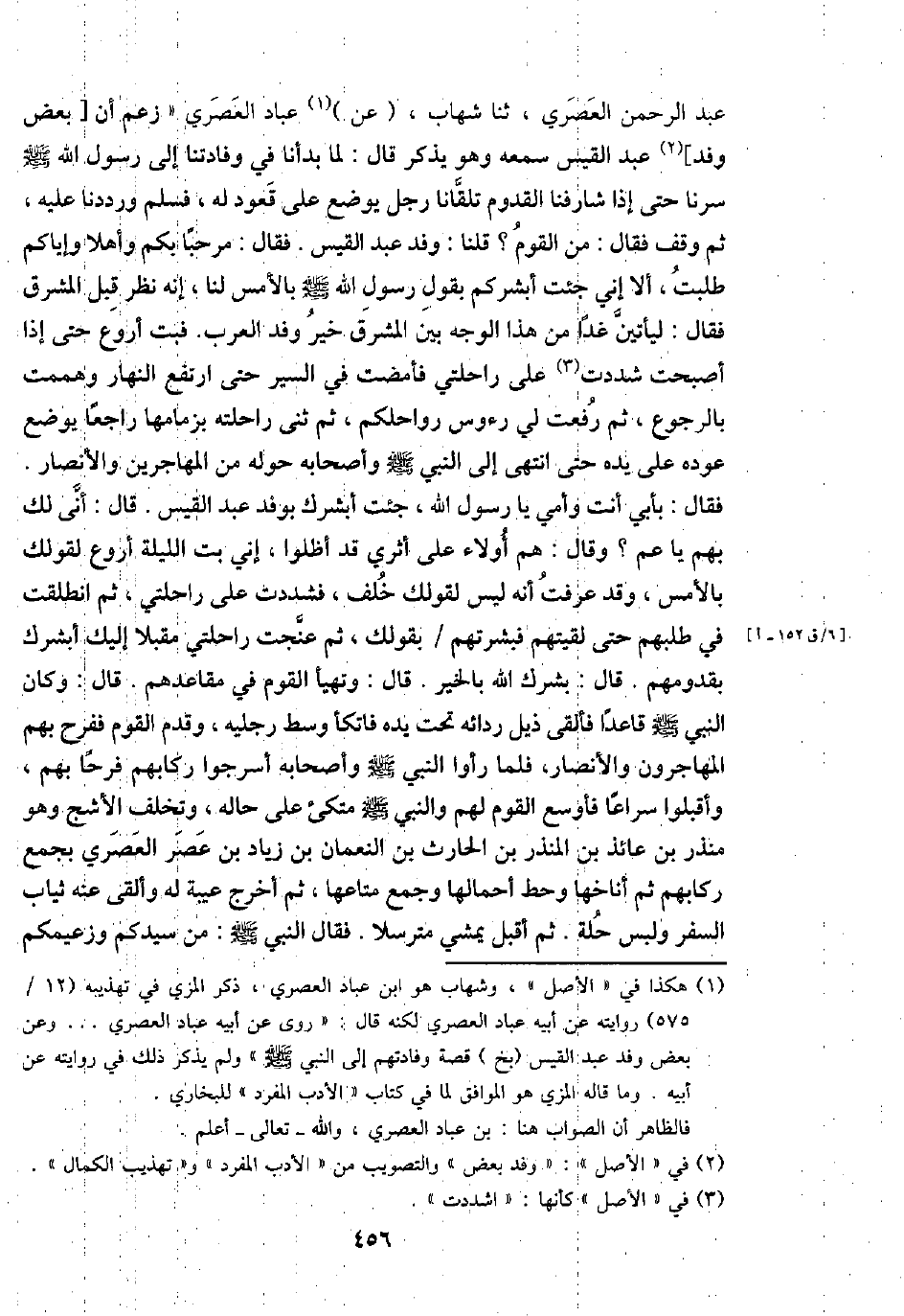 عبد الرَّحْمَن العصري، ثَنَا شهَاب، (عَن) عباد العصري " زعم أَن [بعض وَفد] عبد الْقَيْس سَمعه وَهُوَ يذكر قَالَ: لما بدأنا فِي وفادتنا إِلَى رَسُول الله - صَلَّى اللَّهُ عَلَيْهِ وَسَلَّم َ - سرنا حَتَّى إِذا شارفنا الْقدوم تلقانا رجل يوضع على قعُود لَهُ، فَسلم ورددنا عَلَيْهِ، ثمَّ وقف فَقَالَ: من الْقَوْم؟ قُلْنَا: وَفد عبد الْقَيْس. فَقَالَ: مرْحَبًا بكم وَأهلا وَإِيَّاكُم طلبت، أَلا إِنِّي جِئْت أبشركم بقول رَسُول الله - صَلَّى اللَّهُ عَلَيْهِ وَسَلَّم َ - بالْأَمْس لنا، إِنَّه نظر قبل الْمشرق فَقَالَ: ليَأْتِيَن غَدا من هَذَا الْوَجْه بَين الْمشرق خير وَفد الْعَرَب. فَبت أروع حَتَّى إِذا أَصبَحت شددت على رَاحِلَتي فأمضت فِي السّير حَتَّى ارْتَفع النَّهَار وهممت بِالرُّجُوعِ، ثمَّ رفعت لي رُءُوس رَوَاحِلكُمْ، ثمَّ ثنى رَاحِلَته بزمامها رَاجعا يوضع عوده على يَده حَتَّى انْتهى إِلَى النَّبِي - صَلَّى اللَّهُ عَلَيْهِ وَسَلَّم َ - وَأَصْحَابه حوله من الْمُهَاجِرين وَالْأَنْصَار. فَقَالَ: بِأبي أَنْت وَأمي يَا رَسُول الله، جِئْت أُبَشِّرك بوفد عبد الْقَيْس. قَالَ: أَنى لَك بهم يَا عَم؟ وَقَالَ: هم أولاء على أثري قد أظلوا، إِنِّي بت اللَّيْلَة أروع لِقَوْلِك بالْأَمْس، وَقد عرفت أَنه لَيْسَ لِقَوْلِك خلف، فشددت على رَاحِلَتي، ثمَّ انْطَلَقت فِي طَلَبهمْ حَتَّى لقيتهم فبشرتهم / بِقَوْلِك، ثمَّ عنجت رَاحِلَتي مُقبلا إِلَيْك أُبَشِّرك بقدومهم. قَالَ: بشرك الله بِالْخَيرِ. قَالَ: وتهيأ الْقَوْم فِي مَقَاعِدهمْ. قَالَ: وَكَانَ النَّبِي - صَلَّى اللَّهُ عَلَيْهِ وَسَلَّم َ - قَاعِدا فَألْقى ذيل رِدَائه تَحت يَده فاتكأ وسط رجلَيْهِ، وَقدم الْقَوْم ففرح بهم الْمُهَاجِرُونَ وَالْأَنْصَار، فَلَمَّا رَأَوْا النَّبِي - صَلَّى اللَّهُ عَلَيْهِ وَسَلَّم َ - وَأَصْحَابه أسرجوا رِكَابهمْ فَرحا بهم، وَأَقْبلُوا سرَاعًا فأوسع الْقَوْم لَهُم وَالنَّبِيّ - صَلَّى اللَّهُ عَلَيْهِ وَسَلَّم َ - متكئ على حَاله، وتخلف الْأَشَج وَهُوَ مُنْذر بن عَائِذ بن الْمُنْذر بن الْحَارِث بن النُّعْمَان بن زِيَاد بن عصر العصري بِجمع رِكَابهمْ ثمَّ أناخها وَحط أحمالها وَجمع متاعها، ثمَّ أخرج عَيْبَة لَهُ وَألقى عَنهُ ثِيَاب السّفر وَلَيْسَ حلَّة. ثمَّ أقبل يمشي مترسلا. فَقَالَ النَّبِي - صَلَّى اللَّهُ عَلَيْهِ وَسَلَّم َ -: من سيدكم وزعيمكم