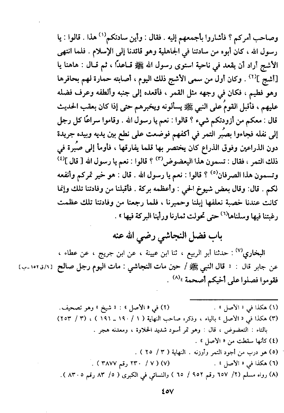 البُخَارِيّ: حَدثنَا أَبُو الرّبيع، ثَنَا ابْن عُيَيْنَة، عَن ابْن جريج، عَن عَطاء، عَن جَابر قَالَ: " قَالَ النَّبِي - صَلَّى اللَّهُ عَلَيْهِ وَسَلَّم َ - / حِين مَاتَ النَّجَاشِيّ: مَاتَ الْيَوْم رجل صَالح فَقومُوا فصلوا على أخيكم أَصْحَمَة ".