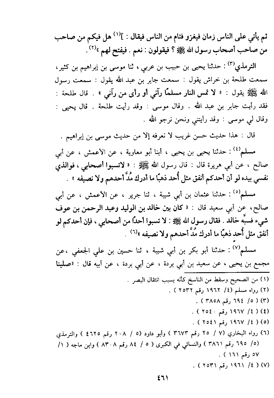 مُسلم: حَدثنَا يحيى بن يحيى، أبنا أَبُو مُعَاوِيَة، عَن الْأَعْمَش، عَن أبي صَالح، عَن أبي هُرَيْرَة قَالَ: قَالَ رَسُول الله - صَلَّى اللَّهُ عَلَيْهِ وَسَلَّم َ -: " لَا تسبوا أَصْحَابِي، فوالذي نَفسِي بِيَدِهِ لَو أَن أحدكُم أنْفق مثل أحد ذَهَبا مَا أدْرك مد أحدهم وَلَا نصيفه ".