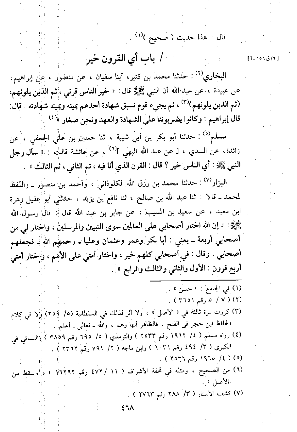 مُسلم: حَدثنَا أَبُو بكر بن أبي شيبَة، ثَنَا حُسَيْن بن عَليّ الْجعْفِيّ، عَن زَائِدَة، عَن السّديّ، [عَن عبد الله الْبَهِي] ، عَن عَائِشَة قَالَت: " سَأَلَ رجل النَّبِي - صَلَّى اللَّهُ عَلَيْهِ وَسَلَّم َ -: أَي النَّاس خير؟ قَالَ: الْقرن الَّذِي أَنا فِيهِ، ثمَّ الثَّانِي، ثمَّ الثَّالِث ".