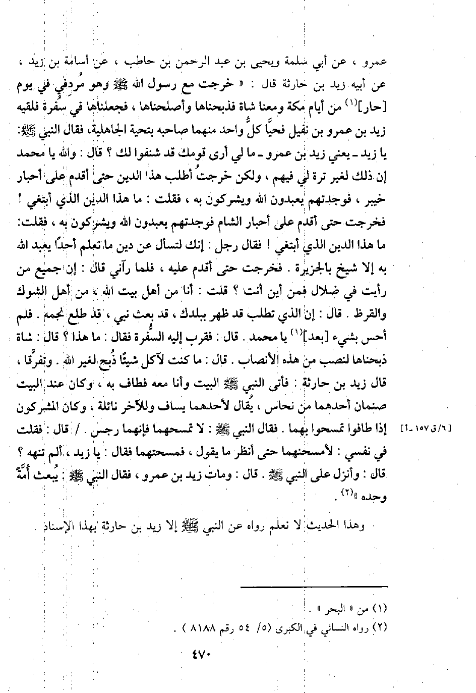 عَمْرو، عَن أبي سَلمَة وَيحيى بن عبد الرَّحْمَن بن حَاطِب، عَن أُسَامَة بن زيد، عَن أَبِيه زيد بن حَارِثَة قَالَ: " خرجت مَعَ رَسُول الله - صَلَّى اللَّهُ عَلَيْهِ وَسَلَّم َ - وَهُوَ مردفي فِي يَوْم [حَار] من أَيَّام مَكَّة ومعنا شَاة فذبحناها وأصلحناها، فجعلناها فِي سفرة فَلَقِيَهُ زيد بن عَمْرو بن نفَيْل فَحَيَّا كل وَاحِد مِنْهُمَا صَاحبه بِتَحِيَّة الْجَاهِلِيَّة، فَقَالَ النَّبِي - صَلَّى اللَّهُ عَلَيْهِ وَسَلَّم َ -: يَا زيد - يَعْنِي زيد بن عَمْرو - مَا لي أرى قَوْمك قد شنفوا لَك؟ قَالَ: وَالله يَا مُحَمَّد إِن ذَلِك لغير ترة لي فيهم، وَلَكِن خرجت أطلب هَذَا الدَّين حَتَّى أقدم على أَحْبَار خَيْبَر، فوجدتهم يعْبدُونَ الله ويشركون بِهِ، فَقلت: مَا هَذَا الدَّين الَّذِي أَبْتَغِي! فَخرجت حَتَّى أقدم على أَحْبَار الشَّام فوجدتهم يعْبدُونَ الله ويشركون بِهِ، فَقلت: مَا هَذَا الدَّين الَّذِي أَبْتَغِي! فَقَالَ رجل: إِنَّك لتسأل عَن دين مَا نعلم أحدا يعبد الله بِهِ إِلَّا شيخ بالجزيرة. فَخرجت حَتَّى أقدم عَلَيْهِ، فَلَمَّا رَآنِي قَالَ: إِن جَمِيع من رَأَيْت فِي ضلال فَمن أَيْن أَنْت؟ قلت: أَنا من أهل بَيت الله، من أهل الشوك والقرظ. قَالَ: إِن الَّذِي تطلب قد ظهر ببلدك، قد بعث نَبِي، قد طلع نجمه. فَلم أحس بِشَيْء [بعد] يَا مُحَمَّد. قَالَ: فَقرب إِلَيْهِ السفرة فَقَالَ: مَا هَذَا؟ قَالَ: شَاة ذبحناها لنصب من هَذِه الأنصاب. قَالَ: مَا كنت لآكل شَيْئا ذبح لغير الله. وتفرقا، قَالَ زيد بن حَارِثَة: فَأتى النَّبِي - صَلَّى اللَّهُ عَلَيْهِ وَسَلَّم َ - الْبَيْت وَأَنا مَعَه فَطَافَ بِهِ، وَكَانَ عِنْد الْبَيْت صنمان أَحدهمَا من نُحَاس، يُقَال لأَحَدهمَا يسَاف وَللْآخر نائلة، وَكَانَ الْمُشْركُونَ إِذا طافوا تَمسحُوا بهما. فَقَالَ النَّبِي - صَلَّى اللَّهُ عَلَيْهِ وَسَلَّم َ -: لَا تمسحهما فَإِنَّهُمَا رِجْس. / قَالَ: فَقلت فِي نَفسِي: لأمسحنهما حَتَّى أنظر مَا يَقُول، فمسحتهما فَقَالَ: يَا زيد، ألم تَنْهَهُ؟ قَالَ: وَأنزل على النَّبِي - صَلَّى اللَّهُ عَلَيْهِ وَسَلَّم َ -. قَالَ: وَمَات زيد بن عَمْرو، فَقَالَ النَّبِي - صَلَّى اللَّهُ عَلَيْهِ وَسَلَّم َ - يبْعَث أمة وَحده ".