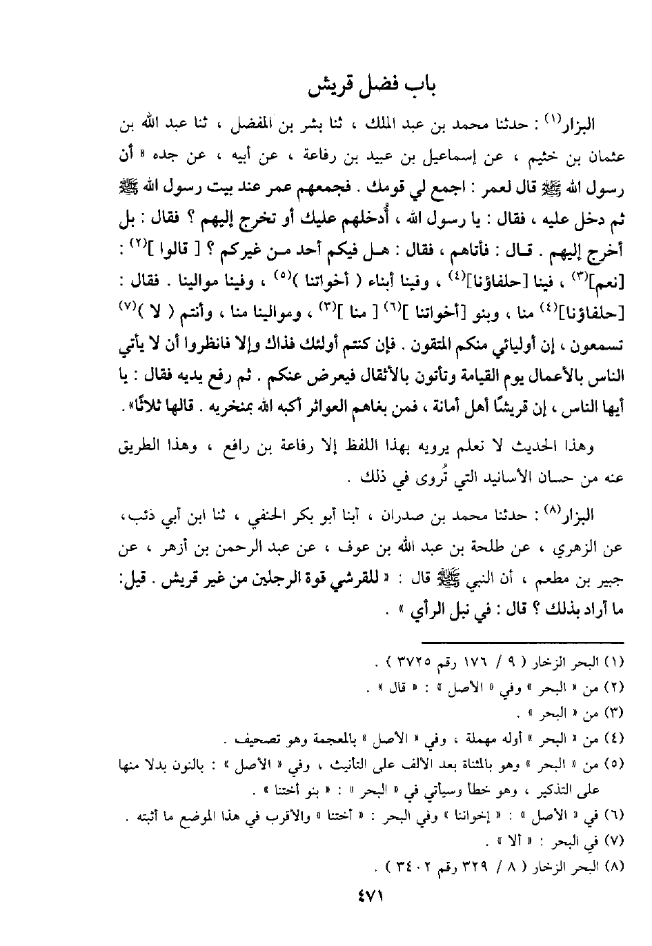 الْبَزَّار: حَدثنَا مُحَمَّد بن عبد الْملك، ثَنَا بشر بن الْمفضل، ثَنَا عبد الله بن عُثْمَان بن خثيم، عَن إِسْمَاعِيل بن عبيد بن رِفَاعَة، عَن أَبِيه، عَن جده " أَن رَسُول الله - صَلَّى اللَّهُ عَلَيْهِ وَسَلَّم َ - قَالَ لعمر: اجْمَعْ لي قَوْمك. فَجَمعهُمْ عمر عِنْد بَيت رَسُول الله - صَلَّى اللَّهُ عَلَيْهِ وَسَلَّم َ - ثمَّ دخل عَلَيْهِ، فَقَالَ: يَا رَسُول الله، أدخلهم عَلَيْك أَو تخرج إِلَيْهِم؟ فَقَالَ: بل أخرج إِلَيْهِم. قَالَ: فَأَتَاهُم، فَقَالَ: هَل فِيكُم أحد من غَيْركُمْ؟ [قَالُوا] : [نعم] ، فِينَا [حلفاؤنا] ، وَفينَا أَبنَاء (أخواتنا) ، وَفينَا موالينا. فَقَالَ: [حلفاؤنا] منا، وَبَنُو [أخواتنا] [منا] ، وموالينا منا، وَأَنْتُم (لَا) تَسْمَعُونَ، إِن أوليائي مِنْكُم المتقون. فَإِن كُنْتُم أُولَئِكَ فَذَاك وَإِلَّا فانظروا أَن لَا يَأْتِي النَّاس بِالْأَعْمَالِ يَوْم الْقِيَامَة وتأتون بالأثقال فَيعرض عَنْكُم. ثمَّ رفع يَدَيْهِ فَقَالَ: يَا أَيهَا النَّاس، إِن قُريْشًا أهل أَمَانَة، فَمن بغاهم العواثر أكبه الله بمنخريه. قَالَهَا ثَلَاثًا ".