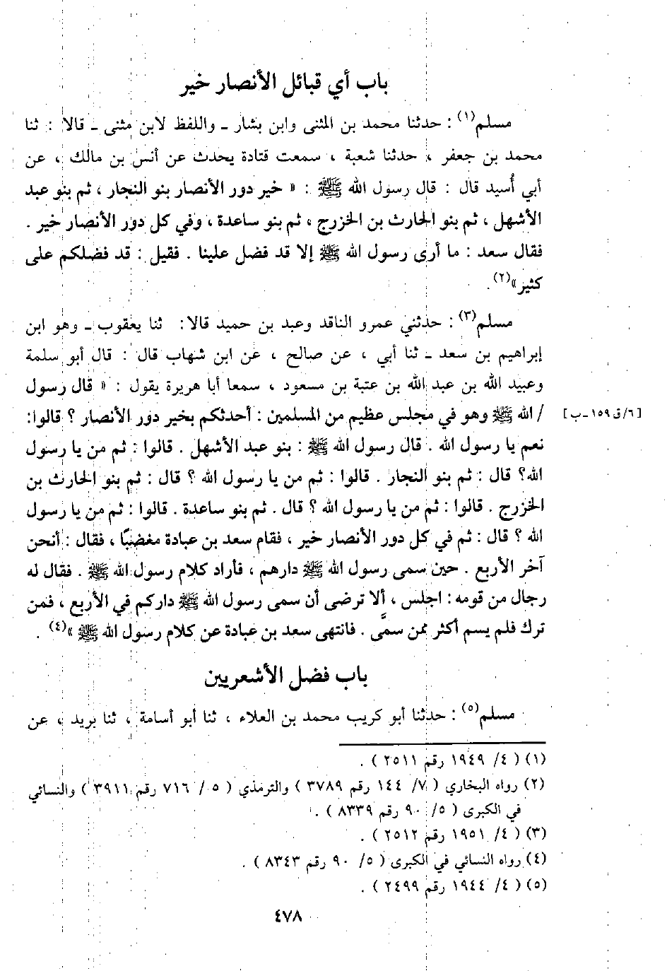 مُسلم: حَدثنَا مُحَمَّد بن الْمثنى وَابْن بشار - وَاللَّفْظ لِابْنِ مثنى - قَالَا: ثَنَا مُحَمَّد بن جَعْفَر، حَدثنَا شُعْبَة، سَمِعت قَتَادَة يحدث عَن أنس بن مَالك، عَن أبي أسيد قَالَ: قَالَ رَسُول الله - صَلَّى اللَّهُ عَلَيْهِ وَسَلَّم َ -: " خير دور الْأَنْصَار بَنو النجار، ثمَّ بَنو عبد الْأَشْهَل، ثمَّ بَنو الْحَارِث بن الْخَزْرَج، ثمَّ بَنو سَاعِدَة، وَفِي كل دور الْأَنْصَار خير. فَقَالَ سعد: مَا أرى رَسُول الله - صَلَّى اللَّهُ عَلَيْهِ وَسَلَّم َ - إِلَّا قد فضل علينا. فَقيل: قد فَضلكُمْ على كثير ".