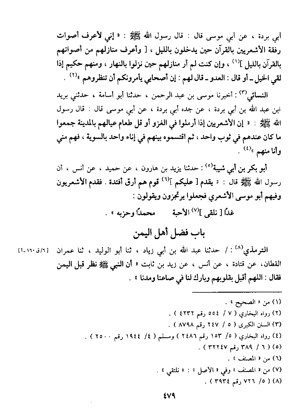 النَّسَائِيّ: أخبرنَا مُوسَى بن عبد الرَّحْمَن، حَدثنَا أَبُو أُسَامَة، حَدثنِي بريد ابْن عبد الله بن أبي بردة، عَن جده أبي بردة، عَن أبي مُوسَى قَالَ: قَالَ رَسُول الله - صَلَّى اللَّهُ عَلَيْهِ وَسَلَّم َ -: " إِن الْأَشْعَرِيين إِذا أرملوا فِي الْغَزْو أَو قل طَعَام عِيَالهمْ بِالْمَدِينَةِ جمعُوا مَا كَانَ عِنْدهم فِي ثوب وَاحِد، ثمَّ اقتسموه بَينهم فِي إِنَاء وَاحِد بِالسَّوِيَّةِ، فهم مني وَأَنا مِنْهُم ".