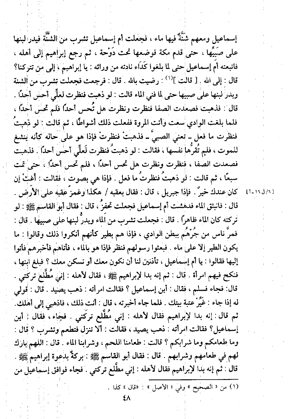 إِسْمَاعِيل وَمَعَهُمْ شنة فِيهَا مَاء، فَجعلت أم إِسْمَاعِيل تشرب من الشنة فيدر لَبنهَا على صبيها، حَتَّى قدم مَكَّة فوضعها تَحت دوحة، ثمَّ رَجَعَ إِبْرَاهِيم إِلَى أَهله، فاتبعته أم إِسْمَاعِيل حَتَّى لما بلغُوا كداء نادته من وَرَائه: يَا إِبْرَاهِيم، إِلَى من تتركنا؟ قَالَ: إِلَى الله. [قَالَت] : رضيت بِاللَّه. قَالَ: فَرَجَعت فَجعلت تشرب من الشنة ويدر لَبنهَا على صبيها حَتَّى لما فني المَاء قَالَت: لَو ذهبت فَنَظَرت لعَلي أحس أحدا. قَالَ: فَذَهَبت فَصَعدت الصَّفَا فَنَظَرت وَنظرت هَل تحس أحدا فَلم تحس أحدا، فَلَمَّا بلغت الْوَادي سعت وَأَتَتْ الْمَرْوَة فَفعلت ذَلِك أشواطا، ثمَّ قَالَت: لَو ذهبت فَنَظَرت مَا فعل - تَعْنِي الصَّبِي - فَذَهَبت فَنَظَرت فَإِذا هُوَ على حَاله كَأَنَّهُ ينشغ للْمَوْت، فَلم تقرها نَفسهَا، فَقَالَت: لَو ذهبت فَنَظَرت لعَلي أحس أحدا. فَذَهَبت فَصَعدت الصَّفَا، فَنَظَرت وَنظرت هَل تحس أحدا، فَلم تحس أحدا حَتَّى تمت سبعا، ثمَّ قَالَت: لَو ذهبت فَنَظَرت مَا فعل. فَإِذا هِيَ بِصَوْت، فَقَالَت: أغث إِن كَانَ عنْدك خير. فَإِذا جِبْرِيل، قَالَ: فَقَالَ بعقبه / هَكَذَا وغمز عقبه على الأَرْض. قَالَ: فانبثق المَاء فدهشت أم إِسْمَاعِيل فَجعلت تحفز، قَالَ: فَقَالَ أَبُو الْقَاسِم - صَلَّى اللَّهُ عَلَيْهِ وَسَلَّم َ -: لَو تركته كَانَ المَاء ظَاهرا. قَالَ: فَجعلت تشرب من المَاء ويدر لَبنهَا على صبيها. قَالَ: فَمر نَاس من جرهم بِبَطن الْوَادي، فَإِذا هم بطير كَأَنَّهُمْ أَنْكَرُوا ذَلِك وَقَالُوا: مَا يكون الطير إِلَّا على مَاء. فبعثوا رسولهم فَنظر فَإِذا هُوَ بِالْمَاءِ، فَأَتَاهُم فَأخْبرهُم فَأتوا إِلَيْهَا فَقَالُوا: يَا أم إِسْمَاعِيل، تأذنين لنا أَن نَكُون مَعَك أَو نسكن مَعَك؟ فَبلغ ابْنهَا، فنكح فيهم امْرَأَة. قَالَ: ثمَّ إِنَّه بدا لإِبْرَاهِيم - صَلَّى اللَّهُ عَلَيْهِ وَسَلَّم َ -، فَقَالَ لأَهله: إِنِّي مطلع تركتي. قَالَ: فجَاء فَسلم، فَقَالَ: أَيْن إِسْمَاعِيل؟ فَقَالَت امْرَأَته: ذهب يصيد. قَالَ: قولي لَهُ إِذا جَاءَ: غير عتبَة بَيْتك. فَلَمَّا جَاءَ أخْبرته، قَالَ: أَنْت ذَلِك، فاذهبي إِلَى أهلك. ثمَّ قَالَ: إِنَّه بدا لإِبْرَاهِيم فَقَالَ لأَهله: إِنِّي مطلع تركتي. فجَاء، فَقَالَ: أَيْن إِسْمَاعِيل؟ فَقَالَت امْرَأَته: ذهب يصيد، فَقَالَت: أَلا تنزل فتطعم وتشرب؟ قَالَ: وَمَا طَعَامكُمْ وَمَا شرابكم؟ قَالَت: طعامنا اللَّحْم، وشرابنا المَاء. قَالَ: اللَّهُمَّ بَارك لَهُم فِي طعامهم وشرابهم. قَالَ: فَقَالَ أَبُو الْقَاسِم - صَلَّى اللَّهُ عَلَيْهِ وَسَلَّم َ -: بركَة بدعوة إِبْرَاهِيم - صَلَّى اللَّهُ عَلَيْهِ وَسَلَّم َ -. قَالَ: ثمَّ إِنَّه بدا لإِبْرَاهِيم فَقَالَ لأَهله: إِنِّي مطلع تركتي. فجَاء فَوَافَقَ إِسْمَاعِيل من