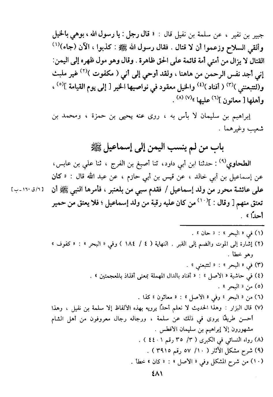الطَّحَاوِيّ: حَدثنَا ابْن أبي دَاوُد، ثَنَا أصبغ بن الْفرج، ثَنَا عَليّ بن عَابس، عَن إِسْمَاعِيل بن أبي خَالِد، عَن قيس بن أبي حَازِم، عَن عبد الله قَالَ: " كَانَ على عَائِشَة مُحَرر من ولد إِسْمَاعِيل / فَقدم سبي من بلعنبر، فَأمرهَا النَّبِي - صَلَّى اللَّهُ عَلَيْهِ وَسَلَّم َ - أَن تعْتق مِنْهُم [وَقَالَ:] من كَانَ عَلَيْهِ رَقَبَة من ولد إِسْمَاعِيل؛ فَلَا يعْتق من حمير أحدا ".