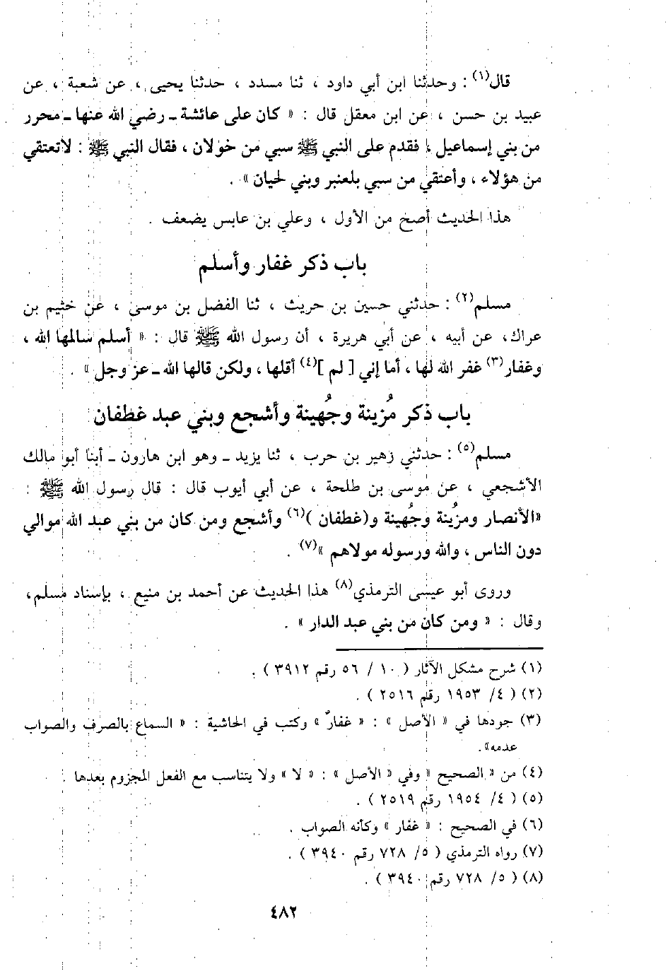 مُسلم: حَدثنِي حُسَيْن بن حُرَيْث، ثَنَا الْفضل بن مُوسَى، عَن خثيم بن عرَاك، عَن أَبِيه، عَن أبي هُرَيْرَة، أَن رَسُول الله - صَلَّى اللَّهُ عَلَيْهِ وَسَلَّم َ - قَالَ: " أسلم سَالَمَهَا الله، وغفار غفر الله لَهَا، أما إِنِّي [لم] أقلهَا، وَلَكِن قَالَهَا الله - عز وَجل ".