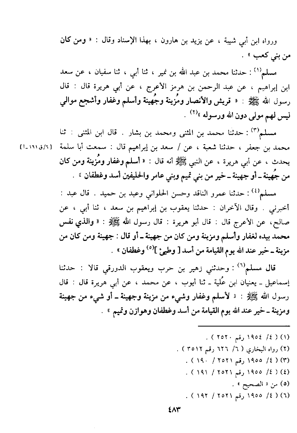 مُسلم: حَدثنَا عَمْرو النَّاقِد وَحسن الْحلْوانِي وَعبد بن حميد. قَالَ عبد: أَخْبرنِي. وَقَالَ الْآخرَانِ: حَدثنَا يَعْقُوب بن إِبْرَاهِيم بن سعد، ثَنَا أبي، عَن صَالح، عَن الْأَعْرَج قَالَ: قَالَ أَبُو هُرَيْرَة: قَالَ رَسُول الله - صَلَّى اللَّهُ عَلَيْهِ وَسَلَّم َ -: " وَالَّذِي نفس مُحَمَّد بِيَدِهِ لغفار وَأسلم وَمُزَيْنَة وَمن كَانَ من جُهَيْنَة - أَو قَالَ: جُهَيْنَة وَمن كَانَ من مزينة - خير عِنْد الله يَوْم الْقِيَامَة من أَسد [وطيئ] وغَطَفَان ".