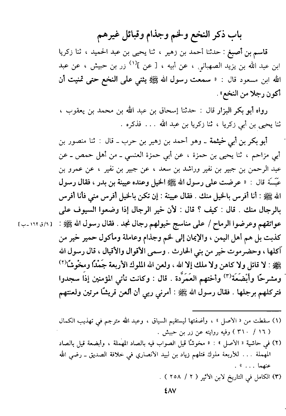 قَاسم بن أصبغ: حَدثنَا أَحْمد بن زُهَيْر، ثَنَا يحيى بن عبد الحميد، ثَنَا زَكَرِيَّا ابْن عبد الله بن يزِيد الصهباني، عَن أَبِيه، [عَن] زر بن حُبَيْش، عَن عبد الله ابْن مَسْعُود قَالَ: " سَمِعت رَسُول الله - صَلَّى اللَّهُ عَلَيْهِ وَسَلَّم َ - يثني على النخع حَتَّى تمنيت أَن أكون رجلا من النخع ".