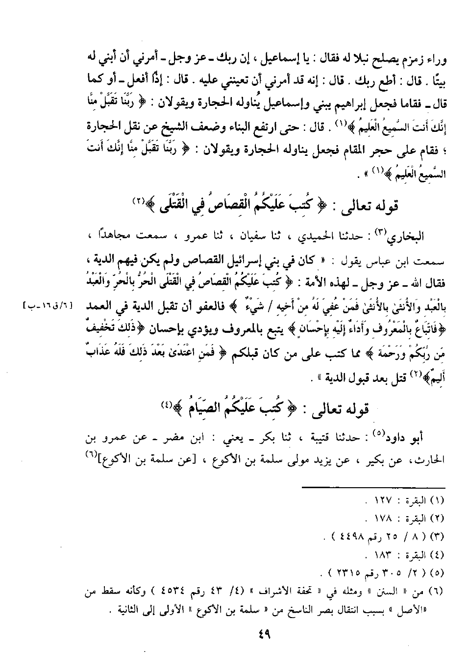 البُخَارِيّ: حَدثنَا الْحميدِي، ثَنَا سُفْيَان، ثَنَا عَمْرو، سَمِعت مُجَاهدًا، سَمِعت ابْن عَبَّاس يَقُول: " كَانَ فِي بني إِسْرَائِيل الْقصاص وَلم يكن فيهم الدِّيَة، فَقَالَ الله - عز وَجل - لهَذِهِ الْأمة: {كتب عَلَيْكُم الْقصاص فِي الْقَتْلَى الْحر بِالْحرِّ وَالْعَبْد بِالْعَبدِ وَالْأُنْثَى بِالْأُنْثَى فَمن عُفيَ لَهُ من أَخِيه / شَيْء} فالعفو أَن تقبل الدِّيَة فِي الْعمد {فاتباع بِالْمَعْرُوفِ وَأَدَاء إِلَيْهِ بِإِحْسَان} يتبع بِالْمَعْرُوفِ وَيُؤَدِّي بِإِحْسَان {ذَلِك تَخْفيف من ربكُم وَرَحْمَة} مِمَّا كتب على من كَانَ قبلكُمْ {فَمن اعْتدى بعد ذَلِك فَلهُ عَذَاب أَلِيم} قتل بعد قبُول الدِّيَة ".