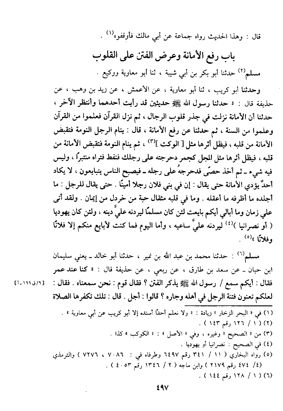 مُسلم: حَدثنَا مُحَمَّد بن عبد الله بن نمير، حَدثنَا أَبُو خَالِد - يَعْنِي سُلَيْمَان ابْن حَيَّان - عَن سعد بن طَارق، عَن ربعي، عَن حُذَيْفَة قَالَ: " كُنَّا عِنْد عمر فَقَالَ: أَيّكُم سمع / رَسُول الله - صَلَّى اللَّهُ عَلَيْهِ وَسَلَّم َ - يذكر الْفِتَن؟ فَقَالَ قوم: نَحن سمعناه. فَقَالَ: لَعَلَّكُمْ تعنون فتْنَة الرجل فِي أَهله وجاره؟ قَالُوا: أجل. قَالَ: تِلْكَ تكفرها الصَّلَاة