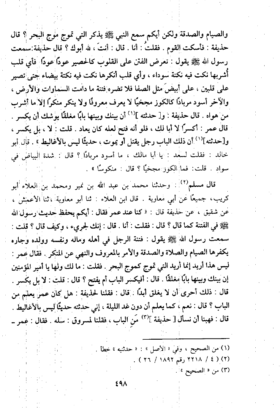 قَالَ مُسلم: وَحدثنَا مُحَمَّد بن عبد الله بن نمير وَمُحَمّد بن الْعَلَاء أَبُو كريب، جَمِيعًا عَن أبي مُعَاوِيَة. قَالَ ابْن الْعَلَاء: ثَنَا أَبُو مُعَاوِيَة، ثَنَا الْأَعْمَش، عَن شَقِيق، عَن حُذَيْفَة قَالَ: " كُنَّا عِنْد عمر فَقَالَ: أَيّكُم يحفظ حَدِيث رَسُول الله - صَلَّى اللَّهُ عَلَيْهِ وَسَلَّم َ - فِي الْفِتْنَة كَمَا قَالَ؟ قَالَ: فَقلت: أَنا. قَالَ: إِنَّك لجريء، وَكَيف قَالَ؟ قلت: سَمِعت رَسُول الله - صَلَّى اللَّهُ عَلَيْهِ وَسَلَّم َ - يَقُول: فتْنَة الرجل فِي أَهله وَمَاله وَنَفسه وَولده وجاره يكفرهَا الصّيام وَالصَّلَاة وَالصَّدَََقَة وَالْأَمر بِالْمَعْرُوفِ وَالنَّهْي عَن الْمُنكر. فَقَالَ عمر: لَيْسَ هَذَا أُرِيد إِنَّمَا أُرِيد الَّتِي تموج كموج الْبَحْر. فَقلت: مَا لَك وَلها يَا أَمِير الْمُؤمنِينَ إِن بَيْنك وَبَينهَا بَابا مغلقا. قَالَ: أفيكسر الْبَاب أم يفتح؟ قَالَ: قلت: لَا بل يكسر. قَالَ: ذَلِك أَحْرَى أَن لَا يغلق أبدا. قَالَ: فَقُلْنَا لِحُذَيْفَة: هَل كَانَ عمر يعلم من الْبَاب؟ قَالَ: نعم، كَمَا يعلم أَن دون غَد اللَّيْلَة، إِنِّي حدثته حَدِيثا لَيْسَ بالأغاليط. قَالَ: فهبنا أَن نسْأَل [حُذَيْفَة] من الْبَاب، فَقُلْنَا لمسروق: سَله. فَقَالَ: عمر -