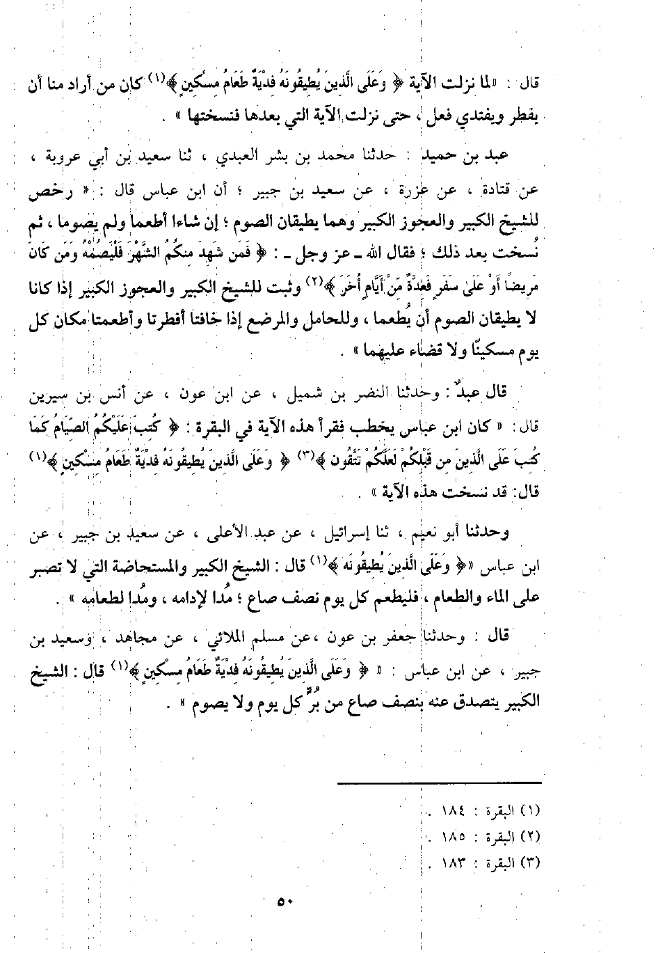 عبد بن حميد: حَدثنَا مُحَمَّد بن بشر الْعَبْدي، ثَنَا سعيد بن أبي عرُوبَة، عَن قَتَادَة، عَن عزْرَة، عَن سعيد بن جُبَير؛ أَن ابْن عَبَّاس قَالَ: رخص للشَّيْخ الْكَبِير والعجوز الْكَبِير وهما يطيقان الصَّوْم؛ إِن شاءا أطعما وَلم يصوما، ثمَّ نسخت بعد ذَلِك؛ فَقَالَ الله - عز وَجل -: {فَمن شهد مِنْكُم الشَّهْر فليصمه وَمن كَانَ مَرِيضا أَو على سفر فَعدَّة من أَيَّام أخر} وَثَبت للشَّيْخ الْكَبِير والعجوز الْكَبِير إِذا كَانَا لَا يطيقان الصَّوْم أَن يطعما، وللحامل والمرضع إِذا خافتا أفطرتا وأطعمتا مَكَان كل يَوْم مِسْكينا وَلَا قَضَاء عَلَيْهِمَا ".