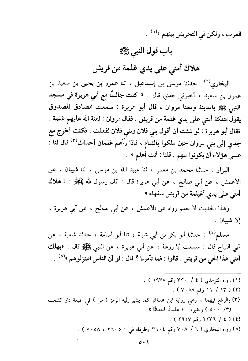 مُسلم: حَدثنَا أَبُو بكر بن أبي شيبَة، ثَنَا أَبُو أُسَامَة، حَدثنَا شُعْبَة، عَن أبي التياح قَالَ: سَمِعت أَبَا زرْعَة، عَن أبي هُرَيْرَة، عَن النَّبِي - صَلَّى اللَّهُ عَلَيْهِ وَسَلَّم َ - قَالَ: " يهْلك أمتِي هَذَا الْحَيّ من قُرَيْش. قَالُوا: فَمَا تَأْمُرنَا؟ قَالَ: لَو أَن النَّاس اعتزلوهم ".