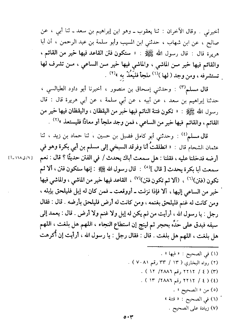 قَالَ مُسلم: وحَدثني أَبُو كَامِل فُضَيْل بن حُسَيْن، ثَنَا حَمَّاد بن زيد، ثَنَا عُثْمَان الشحام قَالَ: " انْطَلَقت أَنا وفرقد السبخي إِلَى مُسلم بن أبي بكرَة وَهُوَ فِي أرضه فَدَخَلْنَا عَلَيْهِ، فَقُلْنَا: هَل سَمِعت أَبَاك يحدث / فِي الْفِتَن حَدِيثا؟ قَالَ: نعم سَمِعت أَبَا بكرَة يحدث [قَالَ] : قَالَ رَسُول الله - صَلَّى اللَّهُ عَلَيْهِ وَسَلَّم َ -: إِنَّهَا سَتَكُون فتن، أَلا ثمَّ تكون (فتن) ، (أَلا ثمَّ تكن فتن) ، الْقَاعِد فِيهَا خير من الْمَاشِي، والماشي فِيهَا خير من السَّاعِي إِلَيْهَا، أَلا فَإِذا نزلت - أَو وَقعت - فَمن كَانَ لَهُ إبل فليلحق بإبله، وَمن كَانَت لَهُ غنم فليلحق بغنمه، وَمن كَانَت لَهُ أَرض فليلحق بأرضه. قَالَ: فَقَالَ رجل: يَا رَسُول الله، أَرَأَيْت من لم يكن لَهُ إبل وَلَا غنم وَلَا أَرض. قَالَ: يعمد إِلَى سَيْفه فَيدق على حَده بِحجر ثمَّ لينج إِن اسْتَطَاعَ النَّجَاء، اللَّهُمَّ هَل بلغت، اللَّهُمَّ هَل بلغت، اللَّهُمَّ هَل بلغت. قَالَ: فَقَالَ رجل: يَا رَسُول الله، أَرَأَيْت إِن أكرهت