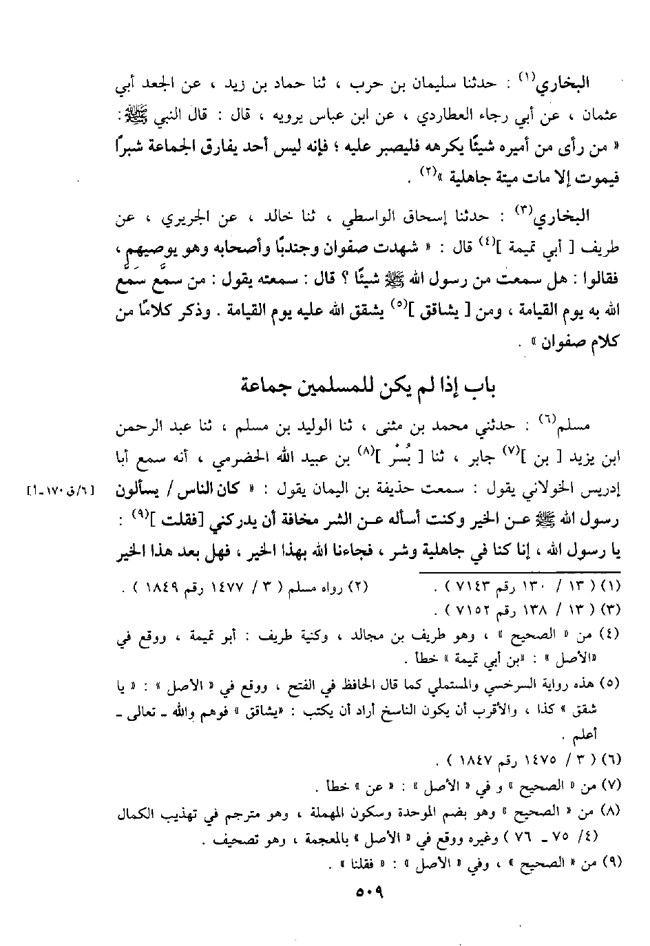مُسلم: حَدثنِي مُحَمَّد بن مثنى، ثَنَا الْوَلِيد بن مُسلم، ثَنَا عبد الرَّحْمَن ابْن يزِيد [بن] جَابر، ثَنَا [بسر] بن عبيد الله الْحَضْرَمِيّ، أَنه سمع أَبَا إِدْرِيس الْخَولَانِيّ يَقُول: سَمِعت حُذَيْفَة بن الْيَمَان يَقُول: " كَانَ النَّاس / يسْأَلُون رَسُول الله - صَلَّى اللَّهُ عَلَيْهِ وَسَلَّم َ - عَن الْخَيْر وَكنت أسأله عَن الشَّرّ مَخَافَة أَن يدركني [فَقلت] : يَا رَسُول الله، إِنَّا كُنَّا فِي جَاهِلِيَّة وَشر، فجاءنا الله بِهَذَا الْخَيْر، فَهَل بعد هَذَا الْخَيْر