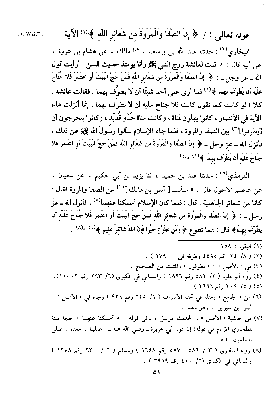 البُخَارِيّ: حَدثنَا عبد الله بن يُوسُف، ثَنَا مَالك، عَن هِشَام بن عُرْوَة، عَن أَبِيه قَالَ: " قلت لعَائِشَة زوج النَّبِي - صَلَّى اللَّهُ عَلَيْهِ وَسَلَّم َ - وَأَنا يَوْمئِذٍ حَدِيث السن: أَرَأَيْت قَول الله - عز وَجل -: {إِن الصَّفَا والمروة من شَعَائِر الله فَمن حج الْبَيْت أَو اعْتَمر فَلَا جنَاح عَلَيْهِ أَن يطوف بهما} فَمَا أرى على أحد شَيْئا أَن لَا يطوف بهما. فَقَالَت عَائِشَة: كلا؛ لَو كَانَت كَمَا تَقول كَانَت فَلَا جنَاح عَلَيْهِ أَن لَا يطوف بهما، إِنَّمَا أنزلت هَذِه الْآيَة فِي الْأَنْصَار، كَانُوا يهلون لمناة، وَكَانَت مَنَاة حَذْو قديد، وَكَانُوا يتحرجون أَن [يطوفوا] بَين الصَّفَا والمروة، فَلَمَّا جَاءَ الْإِسْلَام سَأَلُوا رَسُول الله - صَلَّى اللَّهُ عَلَيْهِ وَسَلَّم َ - عَن ذَلِك، فَأنْزل الله - عز وَجل - {إِن الصَّفَا والمروة من شَعَائِر الله فَمن حج الْبَيْت أَو اعْتَمر فَلَا جنَاح عَلَيْهِ أَن يطوف بهما} ".