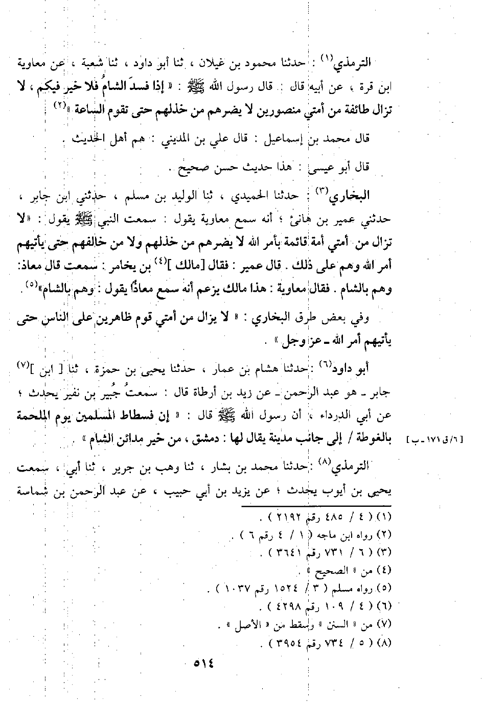 البُخَارِيّ: حَدثنَا الْحميدِي، ثَنَا الْوَلِيد بن مُسلم، حَدثنِي ابْن جَابر، حَدثنِي عُمَيْر بن هَانِئ؛ أَنه سمع مُعَاوِيَة يَقُول: سَمِعت النَّبِي - صَلَّى اللَّهُ عَلَيْهِ وَسَلَّم َ - يَقُول: " لَا تزَال من أمتِي أمة قَائِمَة بِأَمْر الله لَا يضرهم من خذلهم وَلَا من خالفهم حَتَّى يَأْتِيهم أَمر الله وهم على ذَلِك. قَالَ عُمَيْر: فَقَالَ [مَالك] بن يخَامر: سَمِعت قَالَ معَاذ: وهم بِالشَّام. فَقَالَ مُعَاوِيَة: هَذَا مَالك يزْعم أَنه سمع معَاذًا يَقُول: وهم بِالشَّام ".