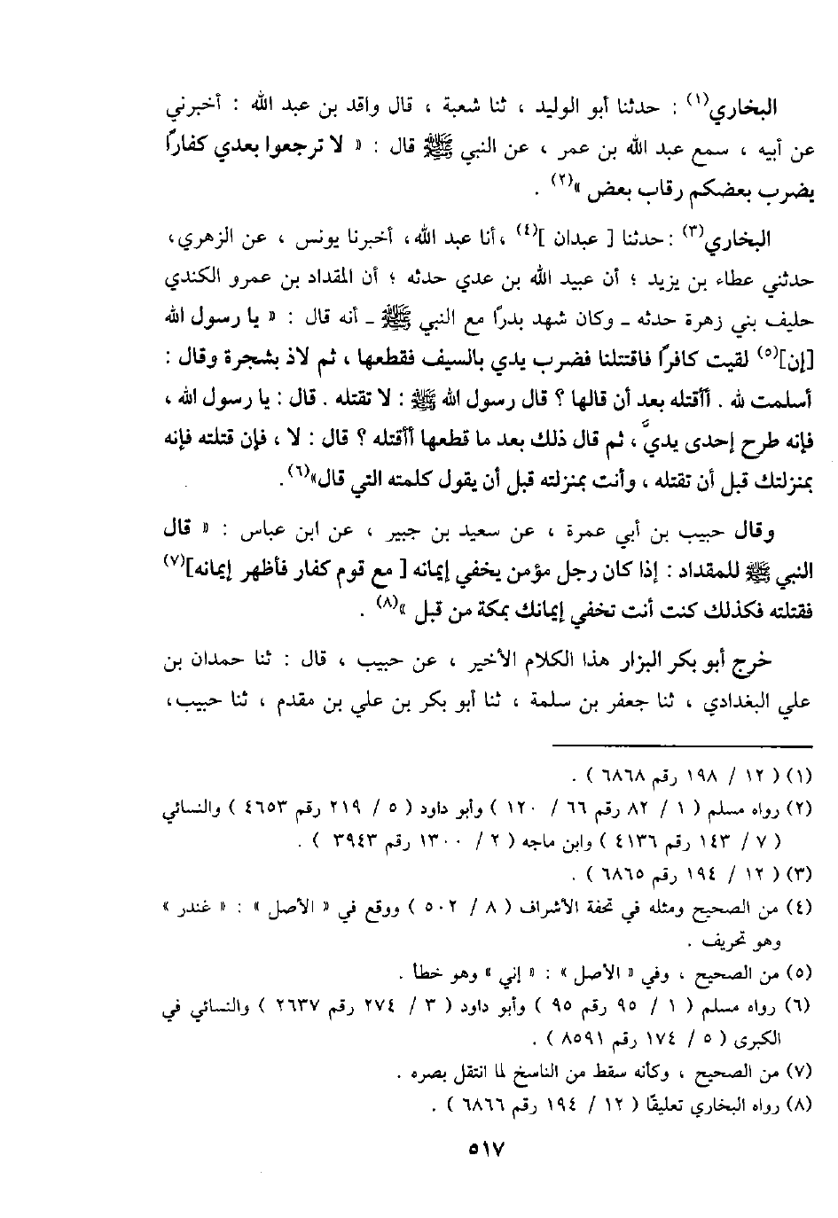 البُخَارِيّ: حَدثنَا [عَبْدَانِ] ، أَنا عبد الله، أخبرنَا يُونُس، عَن الزُّهْرِيّ، حَدثنِي عَطاء بن يزِيد؛ أَن عبيد الله بن عدي حَدثهُ؛ أَن الْمِقْدَاد بن عَمْرو الْكِنْدِيّ حَلِيف بني زهرَة حَدثهُ - وَكَانَ شهد بَدْرًا مَعَ النَّبِي - صَلَّى اللَّهُ عَلَيْهِ وَسَلَّم َ - أَنه قَالَ: " يَا رَسُول الله [إِن] لقِيت كَافِرًا فاقتتلنا فَضرب يَدي بِالسَّيْفِ فقطعها، ثمَّ لَاذَ بشجرة وَقَالَ: أسلمت لله. أأقتله بعد أَن قَالَهَا؟ قَالَ رَسُول الله - صَلَّى اللَّهُ عَلَيْهِ وَسَلَّم َ -: لَا تقتله. قَالَ: يَا رَسُول الله، فَإِنَّهُ طرح إِحْدَى يَدي، ثمَّ قَالَ ذَلِك بعد مَا قطعهَا أأقتله؟ قَالَ: لَا، فَإِن قتلته فَإِنَّهُ بمنزلتك قبل أَن تقتله، وَأَنت بِمَنْزِلَتِهِ قبل أَن يَقُول كَلمته الَّتِي قَالَ ".