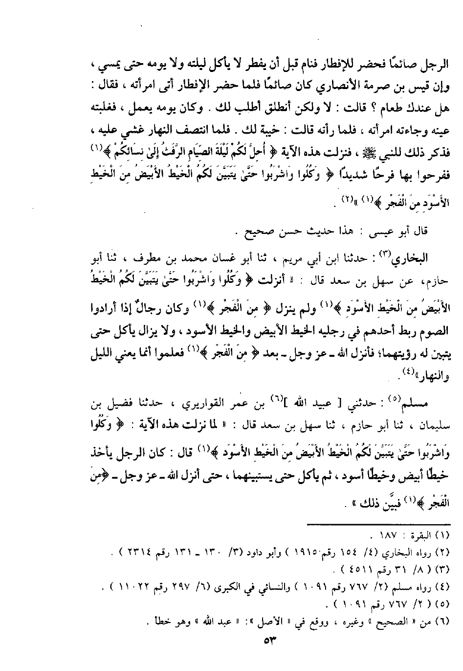 مُسلم: حَدثنِي [عبيد الله] بن عمر القواريري، حَدثنَا فُضَيْل بن سُلَيْمَان، ثَنَا أَبُو حَازِم، ثَنَا سهل بن سعد قَالَ: " لما نزلت هَذِه الْآيَة: {وكلوا وَاشْرَبُوا حَتَّى يتَبَيَّن لكم الْخَيط الْأَبْيَض من الْخَيط الْأسود} قَالَ: كَانَ الرجل يَأْخُذ خيطا أَبيض وخيطا أسود، ثمَّ يَأْكُل حَتَّى يستبينهما، حَتَّى أنزل الله - عز وَجل - {من الْفجْر} فَبين ذَلِك ".