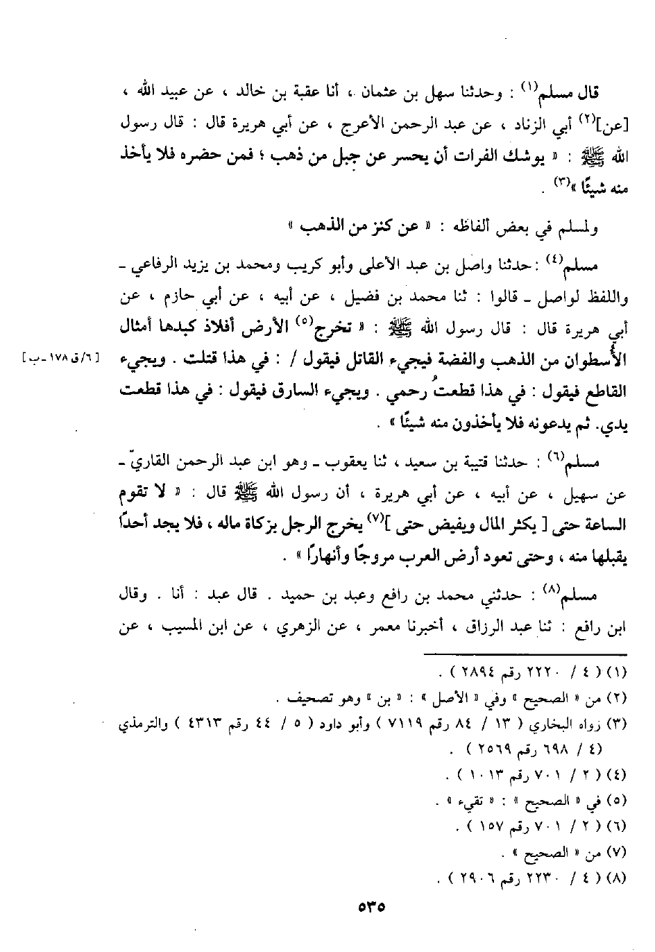 قَالَ مُسلم: وَحدثنَا سهل بن عُثْمَان، أَنا عقبَة بن خَالِد، عَن عبيد الله، [عَن] أبي الزِّنَاد، عَن عبد الرَّحْمَن الْأَعْرَج، عَن أبي هُرَيْرَة قَالَ: قَالَ رَسُول الله - صَلَّى اللَّهُ عَلَيْهِ وَسَلَّم َ -: " يُوشك الْفُرَات أَن يحسر عَن جبل من ذهب؛ فَمن حَضَره فَلَا يَأْخُذ مِنْهُ شَيْئا ".