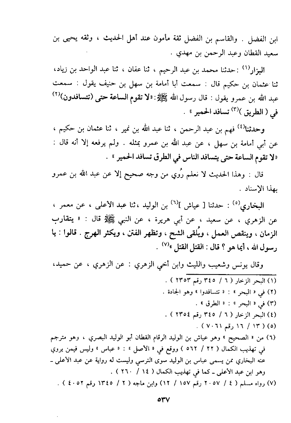 الْبَزَّار: حَدثنَا مُحَمَّد بن عبد الرَّحِيم، ثَنَا عَفَّان، ثَنَا عبد الْوَاحِد بن زِيَاد، ثَنَا عُثْمَان بن حَكِيم قَالَ: سَمِعت أَبَا أُمَامَة بن سهل بن حنيف يَقُول: سَمِعت عبد الله بن عَمْرو يَقُول: قَالَ رَسُول الله - صَلَّى اللَّهُ عَلَيْهِ وَسَلَّم َ -: " لَا تقوم السَّاعَة حَتَّى (تتسافدون) فِي (الطَّرِيق) تسافد الْحمير ".