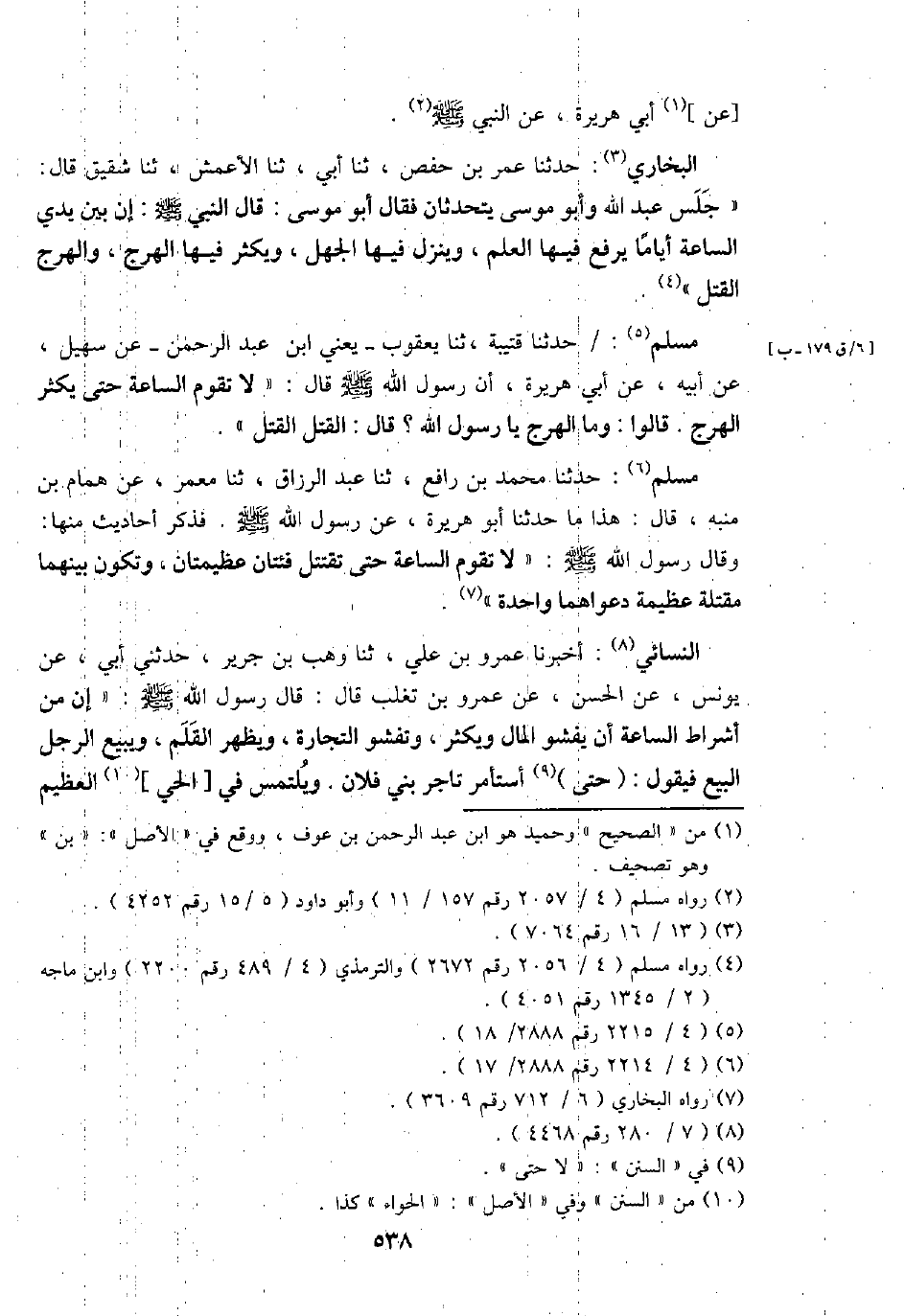 مُسلم: / حَدثنَا قُتَيْبَة، ثَنَا يَعْقُوب - يَعْنِي ابْن عبد الرَّحْمَن - عَن سُهَيْل، عَن أَبِيه، عَن أبي هُرَيْرَة، أَن رَسُول الله - صَلَّى اللَّهُ عَلَيْهِ وَسَلَّم َ - قَالَ: " لَا تقوم السَّاعَة حَتَّى يكثر الْهَرج. قَالُوا: وَمَا الْهَرج يَا رَسُول الله؟ قَالَ: الْقَتْل الْقَتْل ".