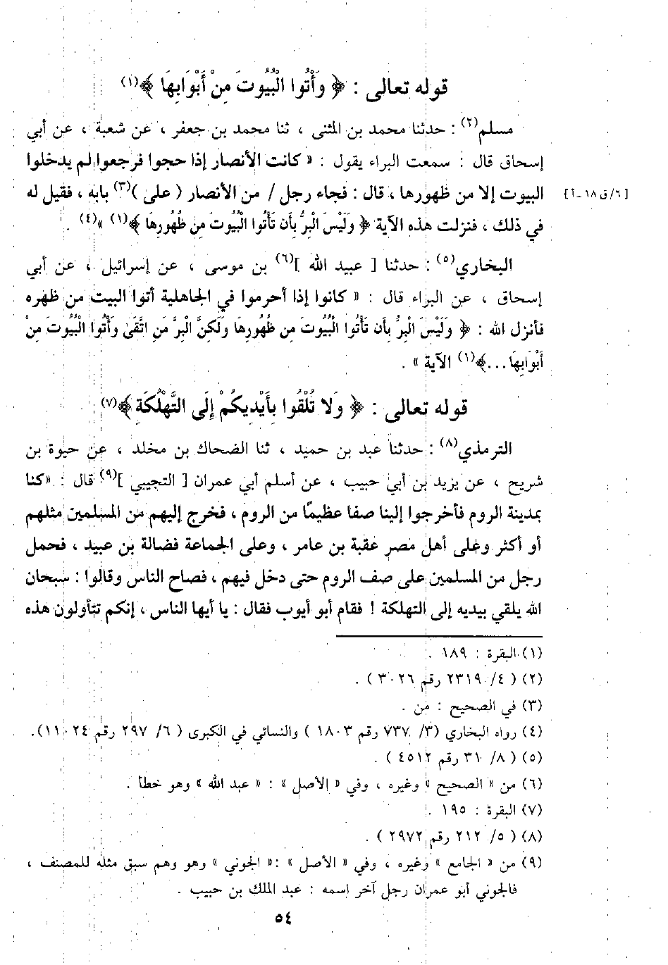 مُسلم: حَدثنَا مُحَمَّد بن الْمثنى، ثَنَا مُحَمَّد بن جَعْفَر، عَن شُعْبَة، عَن أبي إِسْحَاق قَالَ: سَمِعت الْبَراء يَقُول: " كَانَت الْأَنْصَار إِذا حجُّوا فَرَجَعُوا لم يدخلُوا الْبيُوت إِلَّا من ظُهُورهَا، قَالَ: فجَاء رجل / من الْأَنْصَار (على) بَابه، فَقيل لَهُ فِي ذَلِك، فَنزلت هَذِه الْآيَة {وَلَيْسَ الْبر بِأَن تَأْتُوا الْبيُوت من ظُهُورهَا} ".