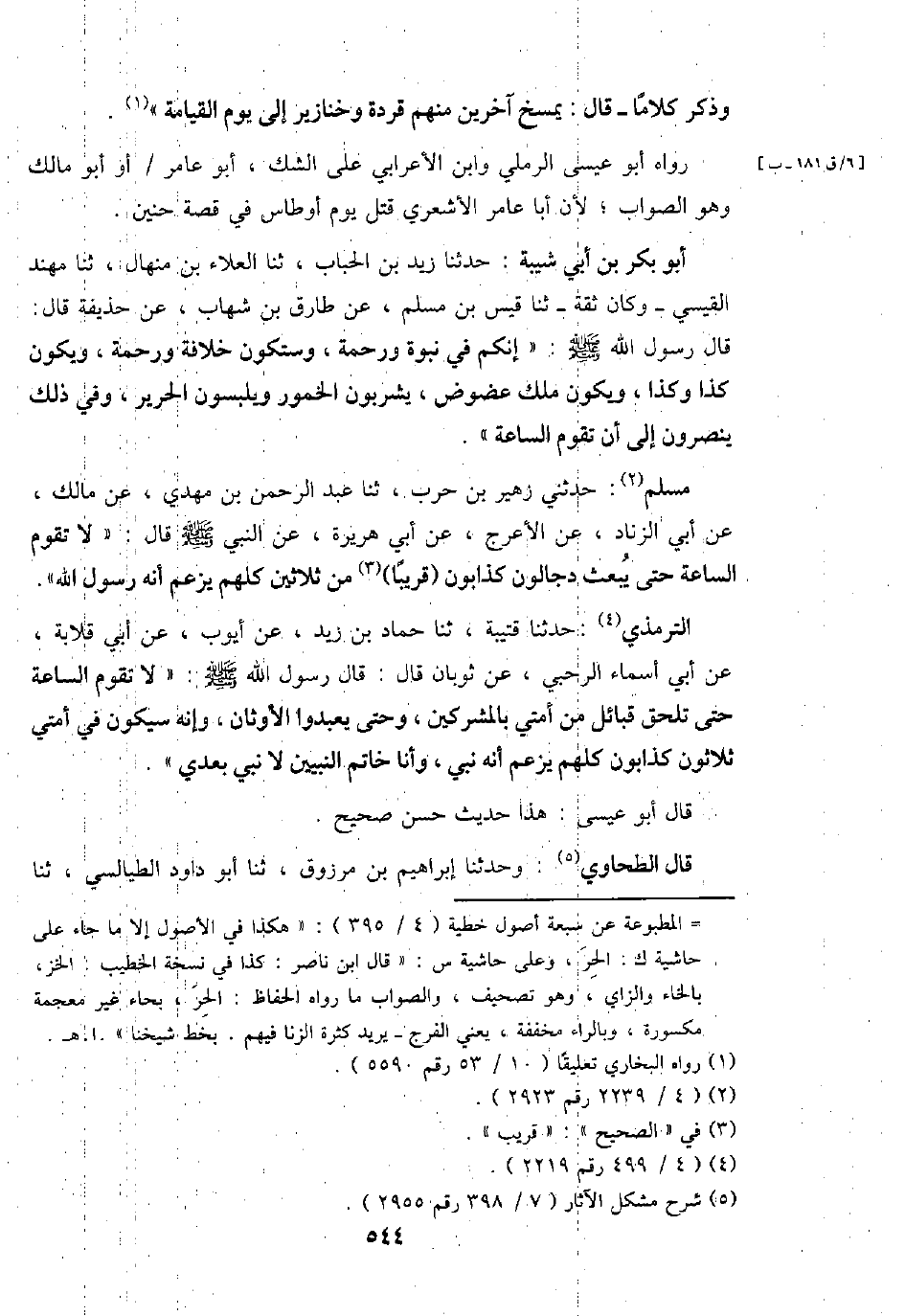 أَبُو بكر بن أبي شيبَة: حَدثنَا زيد بن الْحباب، ثَنَا الْعَلَاء بن منهال، ثَنَا مهند الْقَيْسِي - وَكَانَ ثِقَة - ثَنَا قيس بن مُسلم، عَن طَارق بن شهَاب، عَن حُذَيْفَة قَالَ: قَالَ رَسُول الله - صَلَّى اللَّهُ عَلَيْهِ وَسَلَّم َ -: " إِنَّكُم فِي نبوة وَرَحْمَة، وستكون خلَافَة وَرَحْمَة، وَيكون كَذَا وَكَذَا، وَيكون ملك عضوض، يشربون الْخُمُور وَيلبسُونَ الْحَرِير، وَفِي ذَلِك ينْصرُونَ إِلَى أَن تقوم السَّاعَة ".