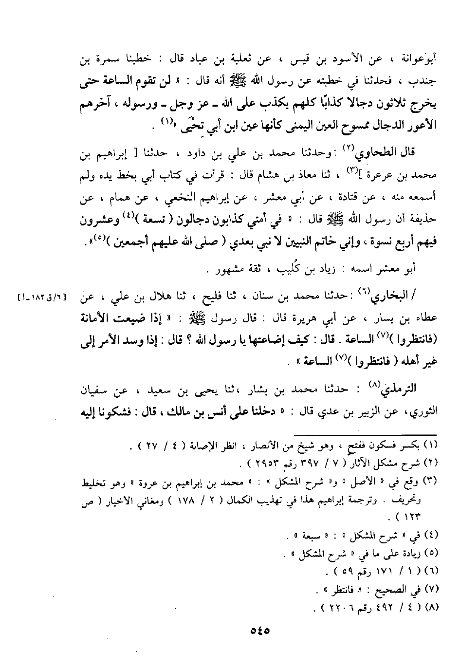 قَالَ الطَّحَاوِيّ: وَحدثنَا مُحَمَّد بن عَليّ بن دَاوُد، حَدثنَا [إِبْرَاهِيم بن مُحَمَّد بن عرْعرة] ، ثَنَا معَاذ بن هِشَام قَالَ: قَرَأت فِي كتاب أبي بِخَط يَده وَلم أسمعهُ مِنْهُ، عَن قَتَادَة، عَن أبي معشر، عَن إِبْرَاهِيم النَّخعِيّ، عَن همام، عَن حُذَيْفَة أَن رَسُول الله - صَلَّى اللَّهُ عَلَيْهِ وَسَلَّم َ - قَالَ: " فِي أمتِي كذابون دجالون (تِسْعَة) وَعِشْرُونَ فيهم أَربع نسْوَة، وَإِنِّي خَاتم النَّبِيين لَا نَبِي بعدِي (صلى الله عَلَيْهِم أَجْمَعِينَ) ".