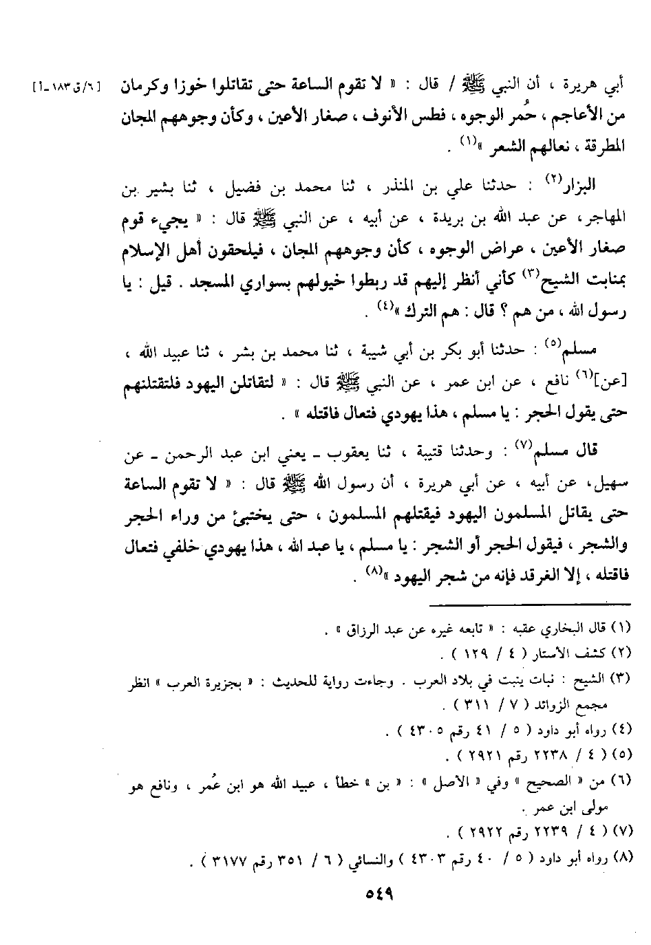 أبي هُرَيْرَة، أَن النَّبِي - صَلَّى اللَّهُ عَلَيْهِ وَسَلَّم َ - / قَالَ: " لَا تقوم السَّاعَة حَتَّى تقاتلوا خوزا وكرمان من الْأَعَاجِم، حمر الْوُجُوه، فطس الأنوف، صغَار الْأَعْين، وَكَأن وُجُوههم المجان المطرقة، نعَالهمْ الشّعْر ".