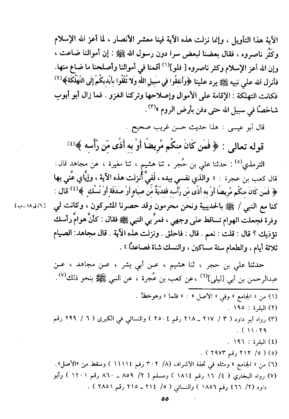 التِّرْمِذِيّ: حَدثنَا عَليّ بن حجر، ثَنَا هشيم، ثَنَا مُغيرَة، عَن مُجَاهِد قَالَ: قَالَ كَعْب بن عجْرَة: " وَالَّذِي نَفسِي بِيَدِهِ، لفي أنزلت هَذِه الْآيَة، وإياي عني بهَا {فَمن كَانَ مِنْكُم مَرِيضا أَو بِهِ أَذَى من رَأسه ففدية من صِيَام أَو صَدَقَة أَو نسك} قَالَ: كُنَّا مَعَ النَّبِي / - صَلَّى اللَّهُ عَلَيْهِ وَسَلَّم َ - بِالْحُدَيْبِية وَنحن محرمون وَقد حصرنا الْمُشْركُونَ، وَكَانَت لي وفرة فَجعلت الْهَوَام تساقط على وَجْهي، فَمر بِي النَّبِي - صَلَّى اللَّهُ عَلَيْهِ وَسَلَّم َ - فَقَالَ: كَأَن هوَام رَأسك تؤذيك؟ قَالَ: قلت: نعم. قَالَ: فَاحْلِقْ. وَنزلت هَذِه الْآيَة. قَالَ مُجَاهِد: الصّيام ثَلَاثَة أَيَّام، وَالطَّعَام سِتَّة مَسَاكِين، والنسك شَاة فَصَاعِدا ".