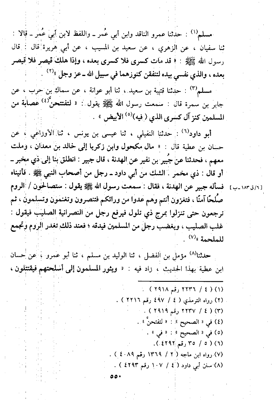 أَبُو دَاوُد: حَدثنَا النُّفَيْلِي، ثَنَا عِيسَى بن يُونُس، ثَنَا الْأَوْزَاعِيّ، عَن حسان بن عَطِيَّة قَالَ: " مَال مَكْحُول وَابْن زَكَرِيَّا إِلَى خَالِد بن معدان، وملت مَعَهم، فحدثنا عَن جُبَير بن نفير عَن الْهُدْنَة، قَالَ جُبَير: انْطلق بِنَا إِلَى ذِي مخبر - أَو قَالَ: ذِي مخمر. الشَّك من أبي دَاوُد - رجل من أَصْحَاب النَّبِي - صَلَّى اللَّهُ عَلَيْهِ وَسَلَّم َ -. فأتيناه فَسَأَلَهُ جُبَير عَن الْهُدْنَة، فَقَالَ: سَمِعت رَسُول الله - صَلَّى اللَّهُ عَلَيْهِ وَسَلَّم َ - يَقُول: ستصالحون / الرّوم صلحا آمنا، فتغزون أَنْتُم وهم عدوا من وَرَائِكُمْ فتنصرون وتغنمون وتسلمون، ثمَّ ترجعون حَتَّى تنزلوا بمرج ذِي تلول فيرفع رجل من النَّصْرَانِيَّة الصَّلِيب فَيَقُول: غلب الصَّلِيب، ويغضب رجل من الْمُسلمين فيدقه؛ فَعِنْدَ ذَلِك تغدر الرّوم وَتجمع للملحمة ".
