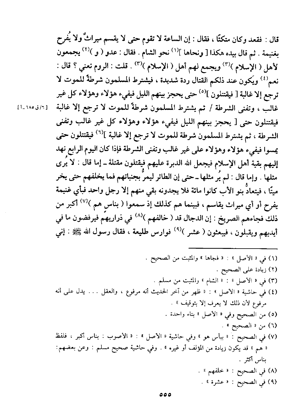 قَالَ: فَقعدَ وَكَانَ مُتكئا، فَقَالَ: إِن السَّاعَة لَا تقوم حَتَّى لَا يقسم مِيرَاث وَلَا يفرح بغنيمة. ثمَّ قَالَ بِيَدِهِ هَكَذَا [ونحاها] نَحْو الشَّام. فَقَالَ: عَدو (و) يجمعُونَ لأهل (الْإِسْلَام) وَيجمع لَهُم أهل (الْإِسْلَام) . قلت: الرّوم تَعْنِي؟ قَالَ: نعم وَيكون عِنْد ذَلِكُم الْقِتَال ردة شَدِيدَة، فَيشْتَرط الْمُسلمُونَ شرطة للْمَوْت لَا ترجع إِلَّا غالبة [فيقتتلون] حَتَّى يحجز بَينهم اللَّيْل فيفيء هَؤُلَاءِ وَهَؤُلَاء كل غير غَالب، وتفنى الشرطة / ثمَّ يشْتَرط الْمُسلمُونَ شرطة للْمَوْت لَا ترجع إِلَّا غالبة فيقتتلون حَتَّى [يحجز بَينهم اللَّيْل فيفيئ هَؤُلَاءِ وَهَؤُلَاء كل غير غَالب وتفنى الشرطة، ثمَّ يشْتَرط الْمُسلمُونَ شرطة للْمَوْت لَا ترجع إِلَى غالبة] فيقتتلون حَتَّى يمسوا فيفيء هَؤُلَاءِ وَهَؤُلَاء على غير غَالب وتفنى الشرطة فَإِذا كَانَ الْيَوْم الرَّابِع نهد إِلَيْهِم بَقِيَّة أهل الْإِسْلَام فَيجْعَل الله الدبرة عَلَيْهِم فيقتلون مقتلة - إِمَّا قَالَ: لَا يرى مثلهَا. وَإِمَّا قَالَ: لم ير مثلهَا - حَتَّى إِن الطَّائِر ليمر بجنباتهم فَمَا يخلفهم حَتَّى يخر مَيتا، فيتعاد بَنو الْأَب كَانُوا مائَة فَلَا يجدونه بَقِي مِنْهُم إِلَّا رجل وَاحِد فَبِأَي غنيمَة يفرح أَو أَي مِيرَاث يقاسم، فَبَيْنَمَا هم كَذَلِك إِذْ سمعُوا (بناس هم) أكبر من ذَلِك فَجَاءَهُمْ الصَّرِيخ: إِن الدَّجَّال قد (خالفهم) فِي ذَرَارِيهمْ فيرفضون مَا فِي أَيْديهم ويقبلون، فيبعثون (عشر) فوارس طَلِيعَة، فَقَالَ رَسُول الله - صَلَّى اللَّهُ عَلَيْهِ وَسَلَّم َ -: إِنِّي
