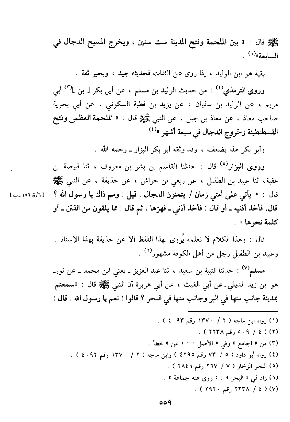 - صَلَّى اللَّهُ عَلَيْهِ وَسَلَّم َ -: " بَين الملحمة وَفتح الْمَدِينَة سِتّ سِنِين، وَيخرج الْمَسِيح الدَّجَّال فِي السَّابِعَة ".