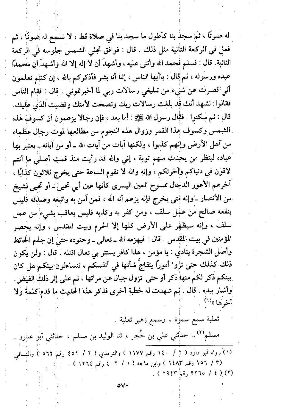 لَهُ صَوتا، ثمَّ سجد بِنَا كأطول مَا سجد بِنَا فِي صَلَاة قطّ، لَا نسْمع لَهُ صَوتا، ثمَّ فعل فِي الرَّكْعَة الثَّانِيَة مثل ذَلِك. قَالَ: فَوَافَقَ تجلي الشَّمْس جُلُوسه فِي الرَّكْعَة الثَّانِيَة. قَالَ: فَسلم فَحَمدَ الله وَأثْنى عَلَيْهِ، وَأشْهد أَن لَا إِلَه إِلَّا الله وَأشْهد أَن مُحَمَّدًا عَبده وَرَسُوله، ثمَّ قَالَ: يَا أَيهَا النَّاس، إِنَّمَا أَنا بشر فأذكركم بِاللَّه، إِن كُنْتُم تعلمُونَ أَنِّي قصرت عَن شَيْء من تبليغي رسالات رَبِّي لما أخبرتموني. قَالَ: فَقَامَ النَّاس فَقَالُوا: نشْهد أَنَّك قد بلغت رسالات رَبك وَنَصَحْت لأمتك وقضيت الَّذِي عَلَيْك. قَالَ: ثمَّ سكتوا. فَقَالَ رَسُول الله - صَلَّى اللَّهُ عَلَيْهِ وَسَلَّم َ -: أما بعد، فَإِن رجَالًا يَزْعمُونَ أَن كسوف هَذِه الشَّمْس وكسوف هَذَا الْقَمَر وَزَوَال هَذِه النُّجُوم من مطالعها لمَوْت رجال عُظَمَاء من أهل الأَرْض وَإِنَّهُم كذبُوا، وَلكنهَا آيَات من آيَات الله - أَو من آيَاته - يعْتَبر بهَا عباده لينْظر من يحدث مِنْهُم تَوْبَة، إِنِّي وَالله قد رَأَيْت مُنْذُ قُمْت أُصَلِّي مَا أَنْتُم لاقون فِي دنياكم وآخرتكم، وَإنَّهُ وَالله لَا تقوم السَّاعَة حَتَّى يخرج ثَلَاثُونَ كذابا، آخِرهم الْأَعْوَر الدَّجَّال مَمْسُوح الْعين الْيُسْرَى كَأَنَّهَا عين أبي تحيى - أَو تحيى لشيخ من الْأَنْصَار - وَإنَّهُ مَتى يخرج فَإِنَّهُ يزْعم أَنه الله، فَمن آمن بِهِ وَاتبعهُ وَصدقه فَلَيْسَ يَنْفَعهُ صَالح من عمل سلف، وَمن كفر بِهِ وَكذبه فَلَيْسَ يُعَاقب بِشَيْء من عمل سلف، وَإنَّهُ سَيظْهر على الأَرْض كلهَا إِلَّا الْحرم وَبَيت الْمُقَدّس، وَإنَّهُ يحصر الْمُؤمنِينَ فِي بَيت الْمُقَدّس. قَالَ: فيهزمه الله - تَعَالَى - وَجُنُوده حَتَّى إِن جذم الْحَائِط وأصل الشَّجَرَة يُنَادي: يَا مُؤمن، هَذَا كَافِر يسْتَتر بِي تعال اقتله. قَالَ: وَلنْ يكون ذَلِك كَذَلِك حَتَّى تروا أمورا يتفاج شَأْنهَا فِي أَنفسكُم، تتساءلون بَيْنكُم هَل كَانَ بَيْنكُم ذكر لكم مِنْهَا ذكر أَو حَتَّى تَزُول جبال عَن مراتها، ثمَّ على إِثْر ذَلِك الْفَيْض. وَأَشَارَ بِيَدِهِ. قَالَ: ثمَّ شهِدت لَهُ خطْبَة أُخْرَى فَذكر هَذَا الحَدِيث مَا قدم كلمة وَلَا أَخّرهَا ".