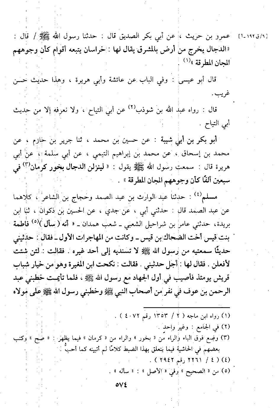 عَمْرو بن حُرَيْث، عَن أبي بكر الصّديق قَالَ: حَدثنَا رَسُول الله - صَلَّى اللَّهُ عَلَيْهِ وَسَلَّم َ - / قَالَ: " الدَّجَّال يخرج من أَرض بالمشرق يُقَال لَهَا: خُرَاسَان يتبعهُ أَقوام كَأَن وُجُوههم المجان المطرقة ".