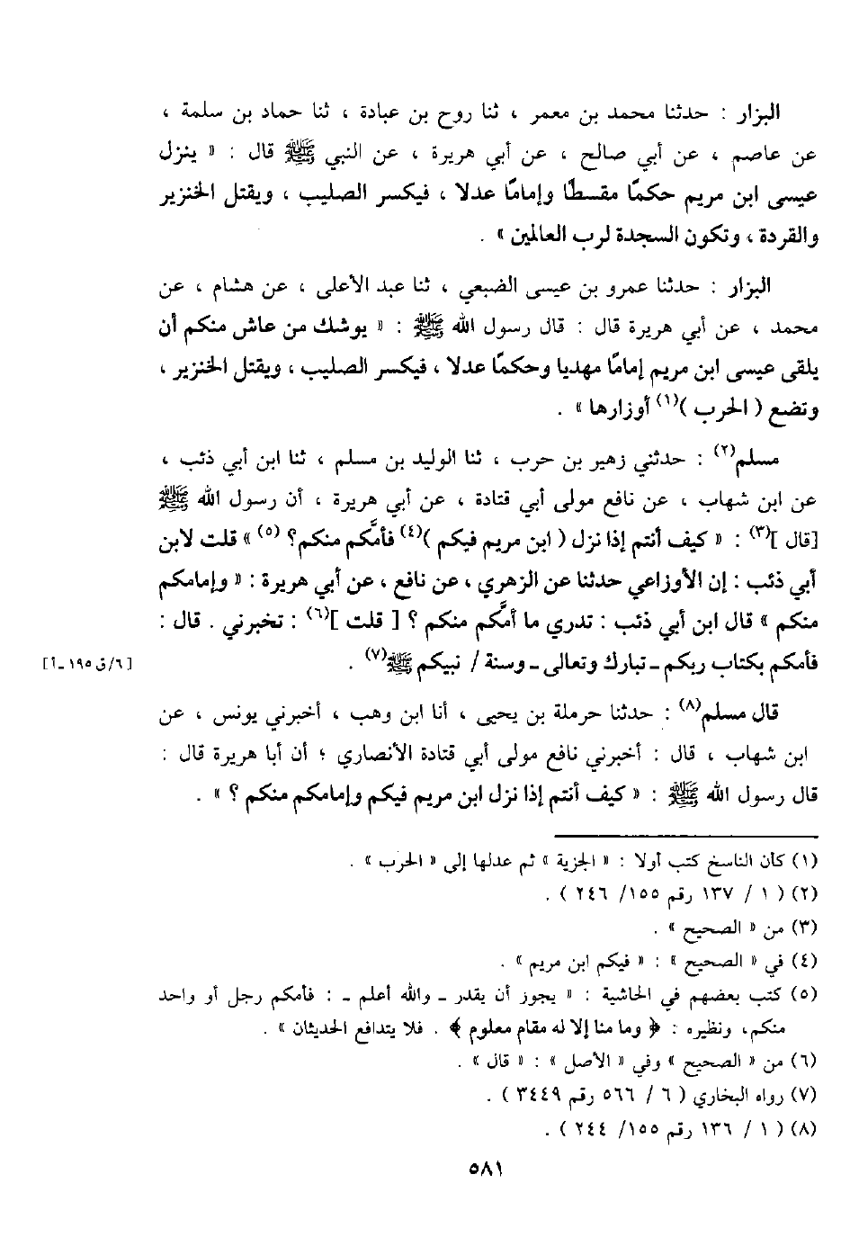 مُسلم: حَدثنِي زُهَيْر بن حَرْب، ثَنَا الْوَلِيد بن مُسلم، ثَنَا ابْن أبي ذِئْب، عَن ابْن شهَاب، عَن نَافِع مولى أبي قَتَادَة، عَن أبي هُرَيْرَة، أَن رَسُول الله - صَلَّى اللَّهُ عَلَيْهِ وَسَلَّم َ -[قَالَ] : " كَيفَ أَنْتُم إِذا نزل (ابْن مَرْيَم فِيكُم) فأمكم مِنْكُم؟ " قلت لِابْنِ أبي ذِئْب: إِن الْأَوْزَاعِيّ حَدثنَا عَن الزُّهْرِيّ، عَن نَافِع، عَن أبي هُرَيْرَة: " وإمامكم مِنْكُم " قَالَ ابْن أبي ذِئْب: تَدْرِي مَا أمكُم مِنْكُم؟ [قلت] : تُخبرنِي. قَالَ: فأمكم بِكِتَاب ربكُم - تبَارك وَتَعَالَى - وَسنة / نَبِيكُم - صَلَّى اللَّهُ عَلَيْهِ وَسَلَّم َ -.