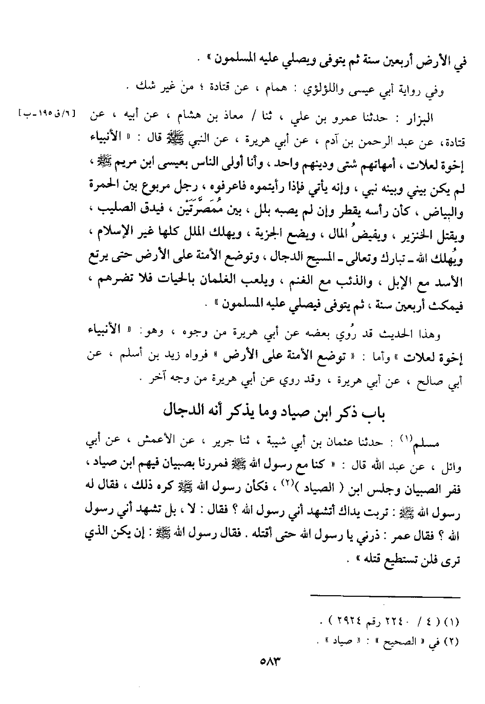 الْبَزَّار: حَدثنَا عَمْرو بن عَليّ، ثَنَا / معَاذ بن هِشَام، عَن أَبِيه، عَن قَتَادَة، عَن عبد الرَّحْمَن بن آدم، عَن أبي هُرَيْرَة، عَن النَّبِي - صَلَّى اللَّهُ عَلَيْهِ وَسَلَّم َ - قَالَ: " الْأَنْبِيَاء إخْوَة لعَلَّات، أمهاتهم شَتَّى وَدينهمْ وَاحِد، وَأَنا أولى النَّاس بِعِيسَى ابْن مَرْيَم - صَلَّى اللَّهُ عَلَيْهِ وَسَلَّم َ -، لم يكن بيني وَبَينه نَبِي، وَإنَّهُ يَأْتِي فَإِذا رَأَيْتُمُوهُ فَاعْرِفُوهُ، رجل مَرْبُوع بَين الْحمرَة وَالْبَيَاض، كَأَن رَأسه يقطر وَإِن لم يصبهُ بَلل، بَين مُمَصَّرَتَيْنِ، فَيدق الصَّلِيب، وَيقتل الْخِنْزِير، وَيفِيض المَال، وَيَضَع الْجِزْيَة، وَيهْلك الْملَل كلهَا غير الْإِسْلَام، وَيهْلك الله - تبَارك وَتَعَالَى - الْمَسِيح الدَّجَّال، وتوضع الأمنة على الأَرْض حَتَّى يرتع الْأسد مَعَ الْإِبِل، وَالذِّئْب مَعَ الْغنم، ويلعب الغلمان بالحيات فَلَا تَضُرهُمْ، فيمكث أَرْبَعِينَ سنة، ثمَّ يتوفى فَيصَلي عَلَيْهِ الْمُسلمُونَ ".