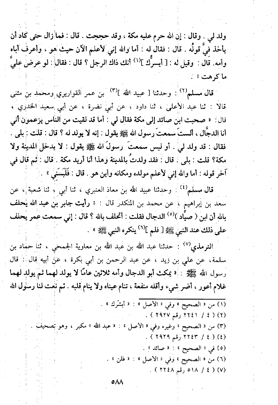 قَالَ مُسلم: وَحدثنَا [عبيد الله] بن عمر القواريري وَمُحَمّد بن مثنى قَالَا: ثَنَا عبد الْأَعْلَى، ثَنَا دَاوُد، عَن أبي نَضرة، عَن أبي سعيد الْخُدْرِيّ، قَالَ: " صَحِبت ابْن صائد إِلَى مَكَّة فَقَالَ لي: أما قد لقِيت من النَّاس يَزْعمُونَ أَنِّي أَنا الدَّجَّال، أَلَسْت سَمِعت رَسُول الله - صَلَّى اللَّهُ عَلَيْهِ وَسَلَّم َ - يَقُول: إِنَّه لَا يُولد لَهُ؟ قَالَ: قلت: بلَى. فَقَالَ: قد ولد لي. أَو لَيْسَ سَمِعت رَسُول الله - صَلَّى اللَّهُ عَلَيْهِ وَسَلَّم َ - يَقُول: لَا يدْخل الْمَدِينَة وَلَا مَكَّة؟ قلت: بلَى. قَالَ: فقد ولدت بِالْمَدِينَةِ وَهَذَا أَنا أُرِيد مَكَّة. قَالَ: ثمَّ قَالَ فِي آخر قَوْله: أما وَالله إِنِّي لأعْلم مولده ومكانه وَأَيْنَ هُوَ. قَالَ: فلبسني ".