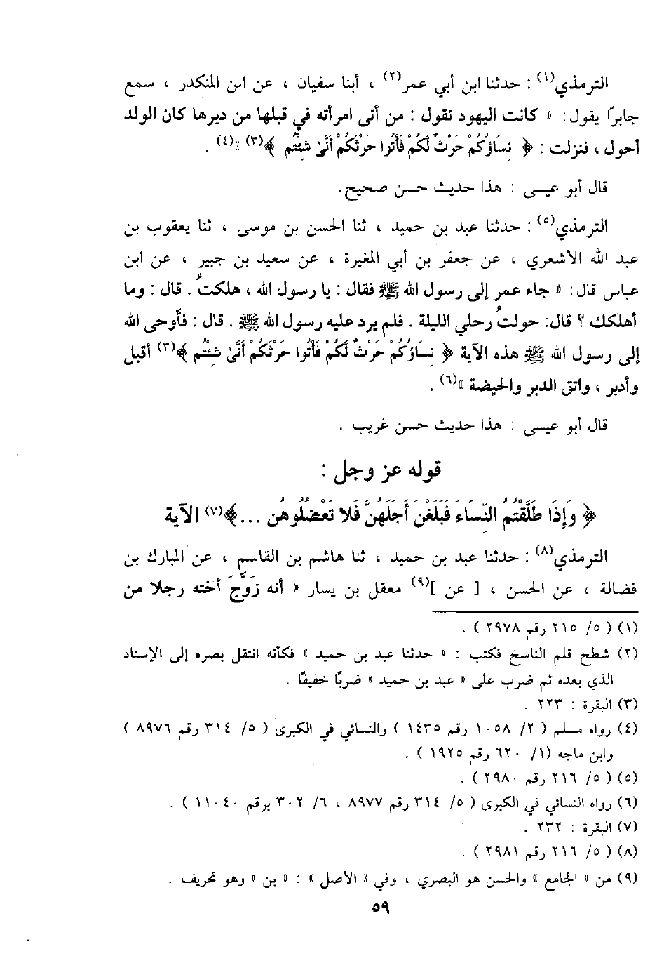 التِّرْمِذِيّ: حَدثنَا ابْن أبي عمر، أبنا سُفْيَان، عَن ابْن الْمُنْكَدر، سمع جَابِرا يَقُول: " كَانَت الْيَهُود تَقول: من أَتَى امْرَأَته فِي قبلهَا من دبرهَا كَانَ الْوَلَد أَحول، فَنزلت: {نِسَاؤُكُمْ حرث لكم فَأتوا حَرْثكُمْ أَنى شِئْتُم} ".