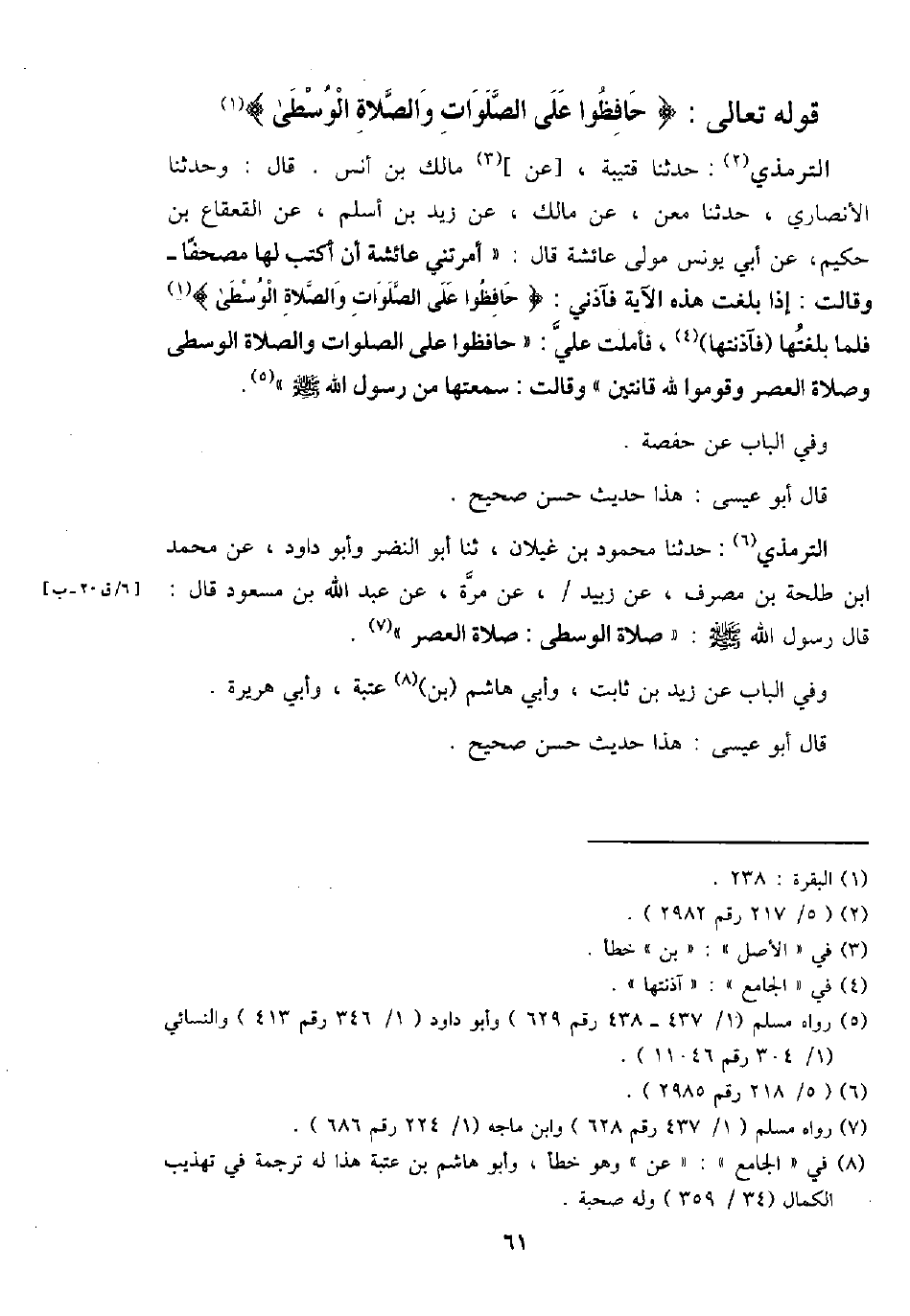 التِّرْمِذِيّ: حَدثنَا مَحْمُود بن غيلَان، ثَنَا أَبُو النَّضر وَأَبُو دَاوُد، عَن مُحَمَّد ابْن طَلْحَة بن مصرف، عَن زبيد /، عَن مرّة، عَن عبد الله بن مَسْعُود قَالَ: قَالَ رَسُول الله - صَلَّى اللَّهُ عَلَيْهِ وَسَلَّم َ -: " صَلَاة الْوُسْطَى: صَلَاة الْعَصْر ".