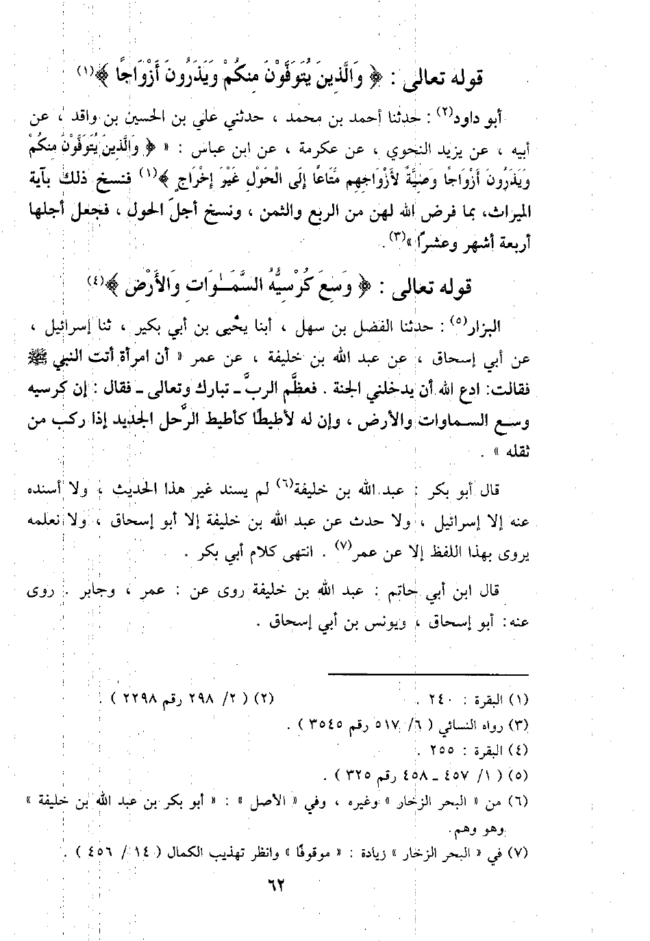 أَبُو دَاوُد: حَدثنَا أَحْمد بن مُحَمَّد، حَدثنِي عَليّ بن الْحُسَيْن بن وَاقد، عَن أَبِيه، عَن يزِيد النَّحْوِيّ، عَن عِكْرِمَة، عَن ابْن عَبَّاس: " {وَالَّذين يتوفون مِنْكُم ويذرون أَزْوَاجًا وَصِيَّة لأزواجهم مَتَاعا إِلَى الْحول غير إِخْرَاج} فنسخ ذَلِك بِآيَة الْمِيرَاث، بِمَا فرض الله لَهُنَّ من الرّبع وَالثمن، وَنسخ أجل الْحول، فَجعل أجلهَا أَرْبَعَة أشهر وَعشرا ".