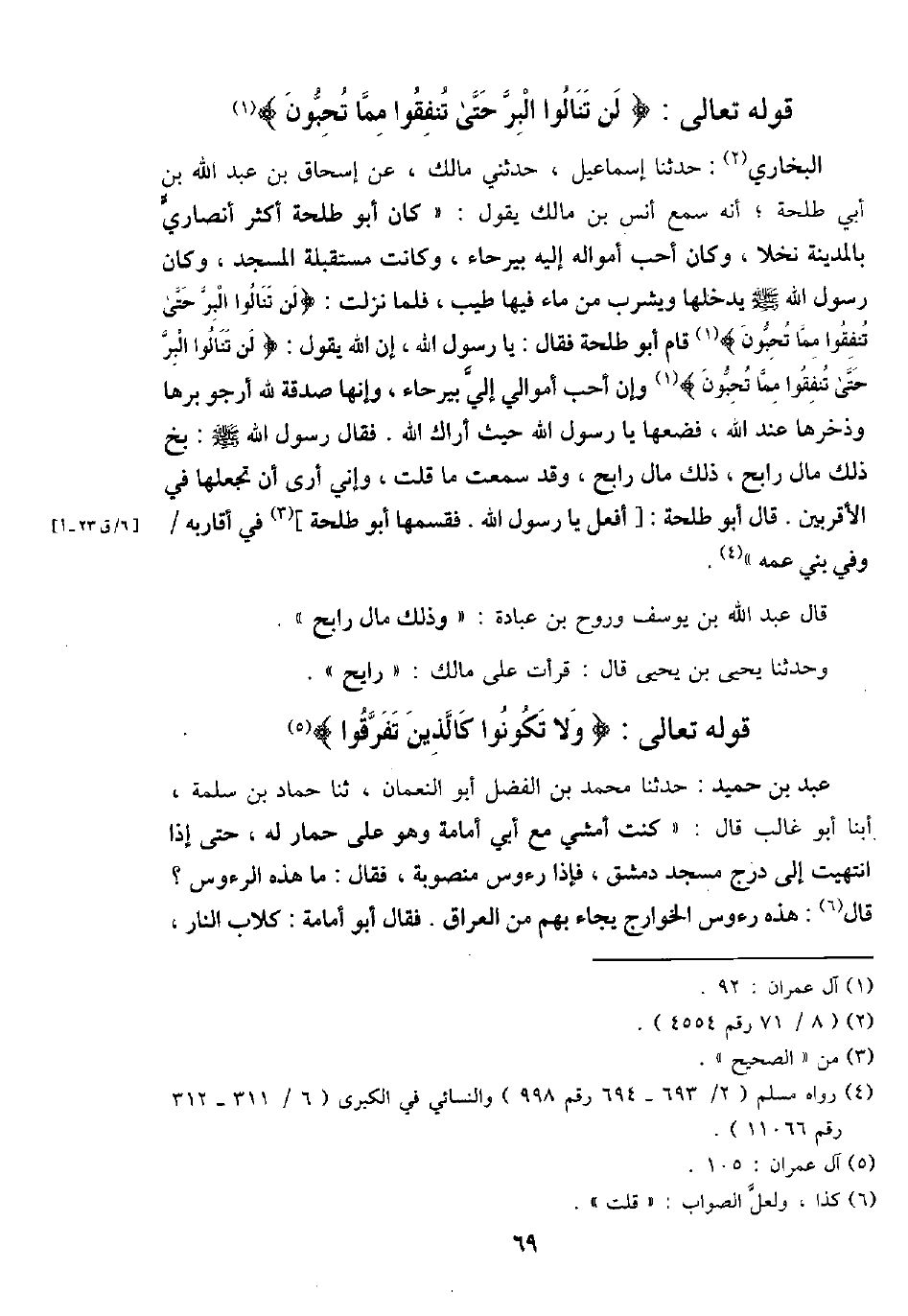 البُخَارِيّ: حَدثنَا إِسْمَاعِيل، حَدثنِي مَالك، عَن إِسْحَاق بن عبد الله بن أبي طَلْحَة؛ أَنه سمع أنس بن مَالك يَقُول: " كَانَ أَبُو طَلْحَة أَكثر أَنْصَارِي بِالْمَدِينَةِ نخلا، وَكَانَ أحب أَمْوَاله إِلَيْهِ بيرحاء، وَكَانَت مُسْتَقْبلَة الْمَسْجِد، وَكَانَ رَسُول الله - صَلَّى اللَّهُ عَلَيْهِ وَسَلَّم َ - يدخلهَا وَيشْرب من مَاء فِيهَا طيب، فَلَمَّا نزلت: {لن تنالوا الْبر حَتَّى تنفقوا مِمَّا تحبون} قَامَ أَبُو طَلْحَة فَقَالَ: يَا رَسُول الله، إِن الله يَقُول: {لن تنالوا الْبر حَتَّى تنفقوا مِمَّا تحبون} وَإِن أحب أَمْوَالِي إِلَيّ بيرحاء، وَإِنَّهَا صَدَقَة لله أَرْجُو برهَا وَذُخْرهَا عِنْد الله، فضعها يَا رَسُول الله حَيْثُ أَرَاك الله. فَقَالَ رَسُول الله - صَلَّى اللَّهُ عَلَيْهِ وَسَلَّم َ -: بخ ذَلِك مَال رابح، ذَلِك مَال رابح، وَقد سَمِعت مَا قلت، وَإِنِّي أرى أَن تجعلها فِي الْأَقْرَبين. قَالَ أَبُو طَلْحَة: [أفعل يَا رَسُول الله. فَقَسمهَا أَبُو طَلْحَة] فِي أَقَاربه / وَفِي بني عَمه ".